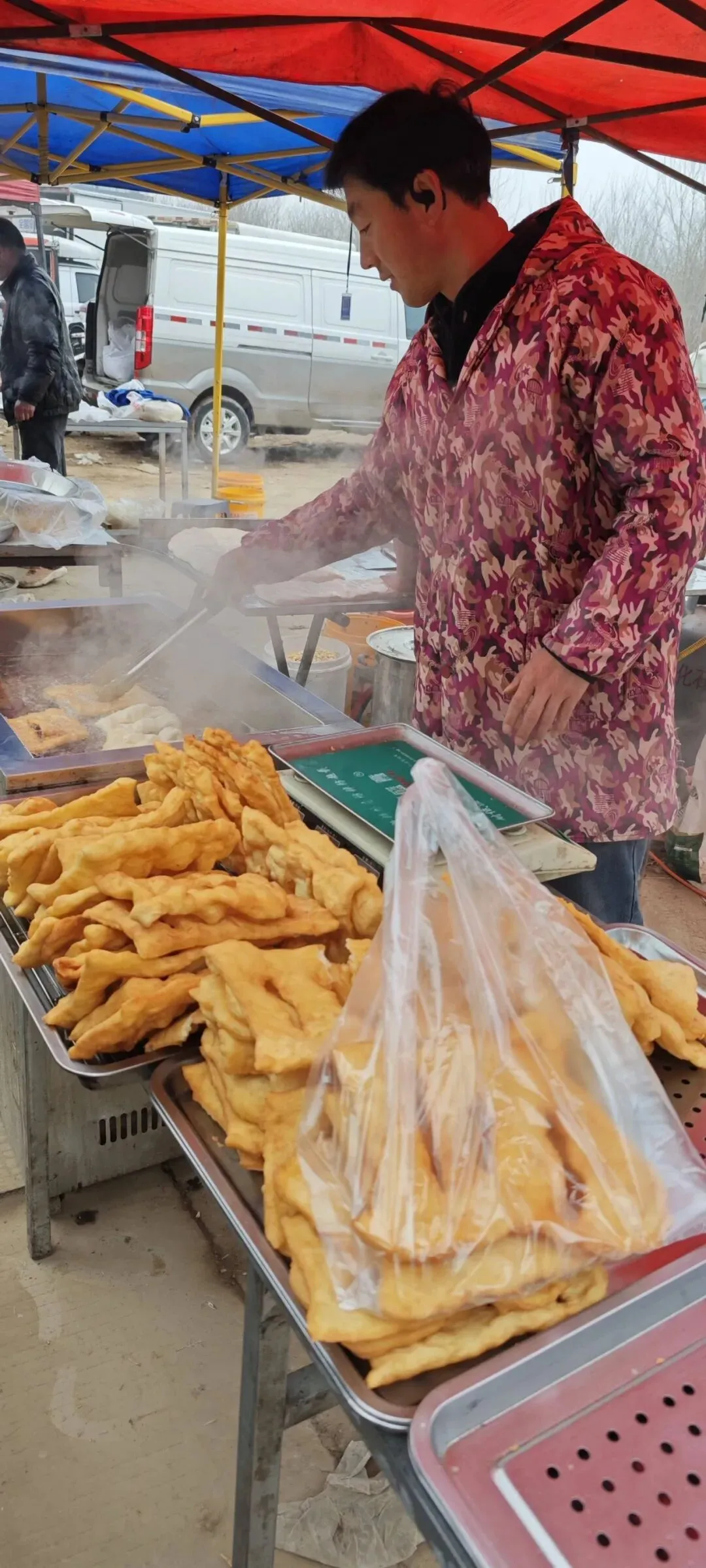 这家炸油饼太香了,香味儿直往鼻子眼儿里钻。八块钱一斤,称着卖。
