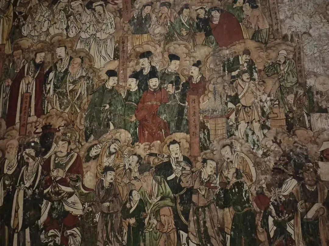122平方米的墙面上,508位儒、释、道人物济济一堂,每组人物旁皆有榜题标明身份。这不是普通的佛教壁画,而是一幅完整的水陆画——一种为超度水陆众生而绘制的宗教绘画体系。