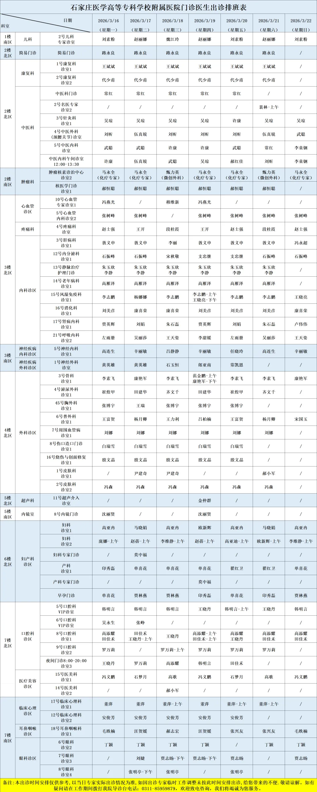 医院开设预防保健科、内科、外科、妇产科、儿科、眼科、耳鼻喉科、口腔科、皮肤科、医疗美容科、肿瘤科、急诊科、重症医学科、康复科、麻醉科、医学检验科、病理科、医学影像科、中医科等50余个一、二级临床、医技科室,能够完成疑难、危重患者的多学科综合治疗。