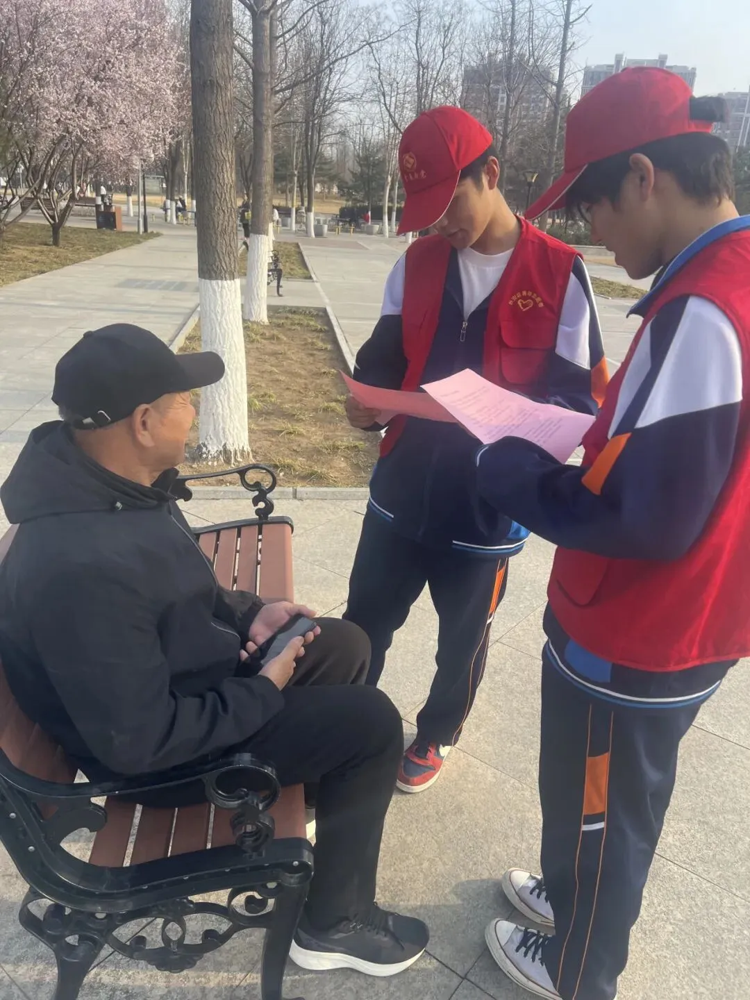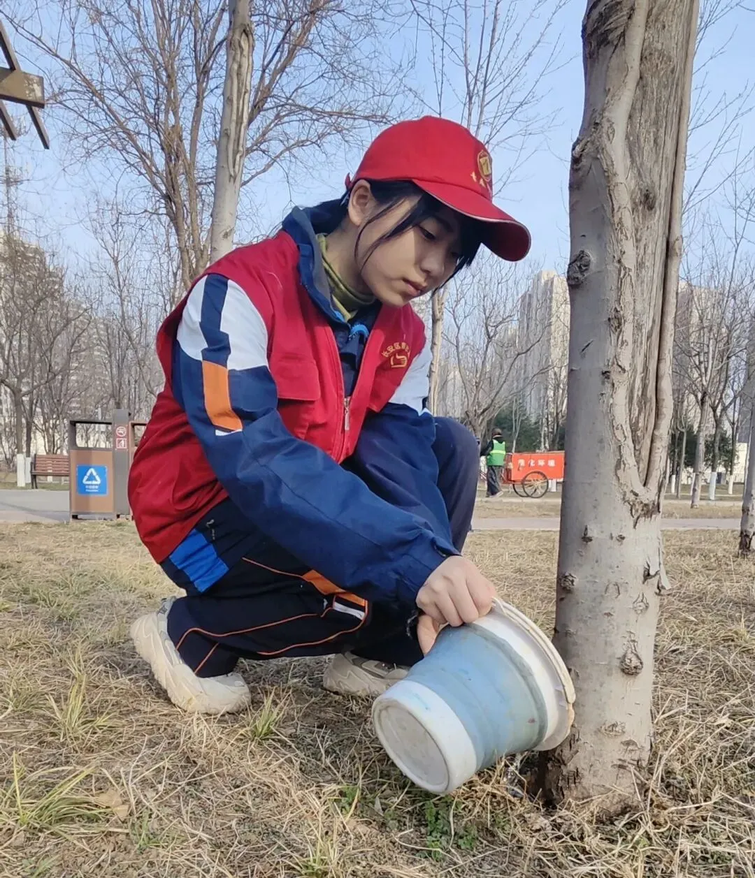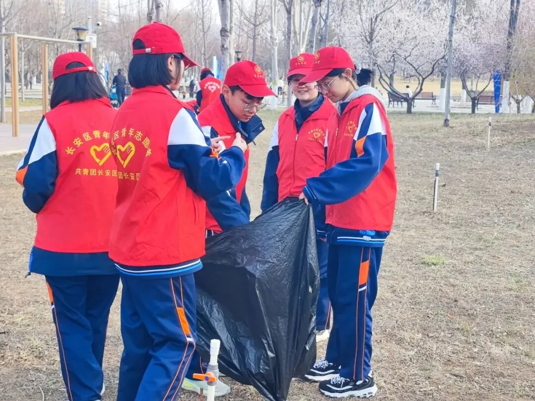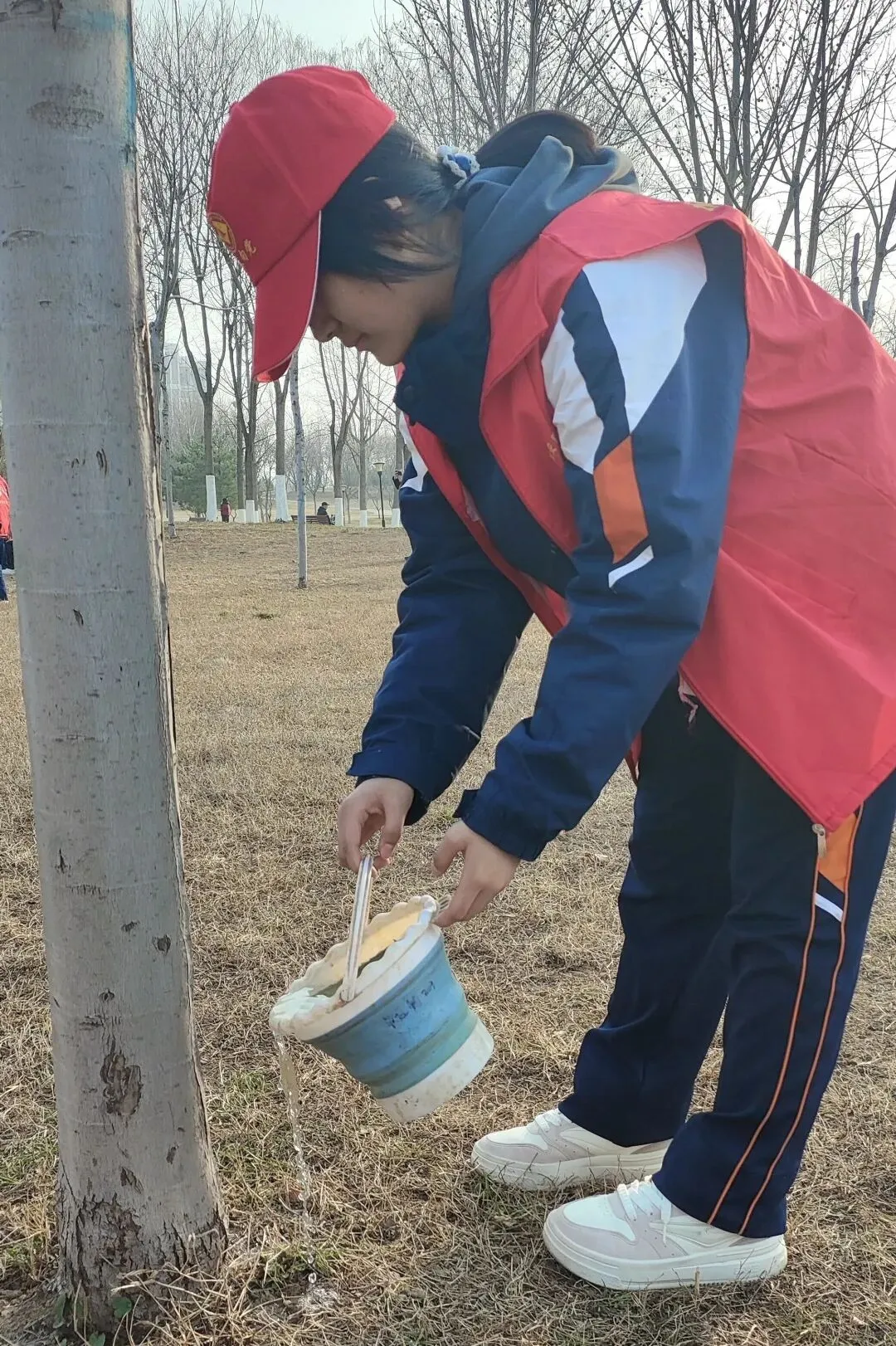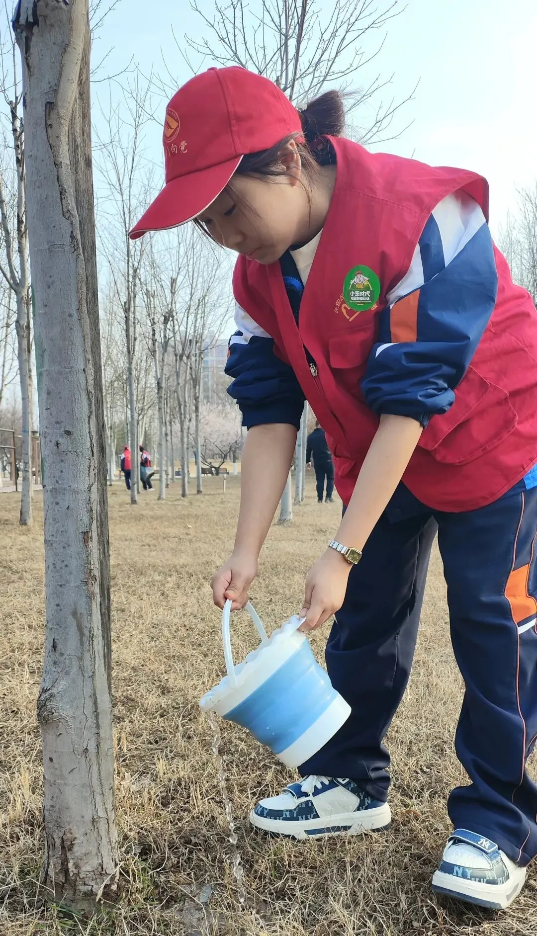 垃圾捡拾组的同学们手持垃圾夹、垃圾袋,对公园步道、草坪、休闲广场进行细致清理,重点捡拾烟烟头、纸屑、塑料瓶等杂物,尤其关注绿化带内的白色垃圾,严格落实垃圾分类投放要求;绿植浇水组在公园园艺师傅的专业指导下,用水桶为指定区域的绿篱、新栽花卉及树木悉心浇灌,详细了解植物生长位置与浇灌注意事项,杜绝浪费水资源;宣传倡导组结合植树节主题,向过往游客发起环保倡议,积极宣传“爱护花草树木”“垃圾分类”等文明环保理念,呼吁共同守护绿色家园。