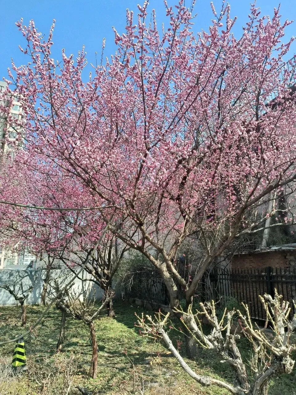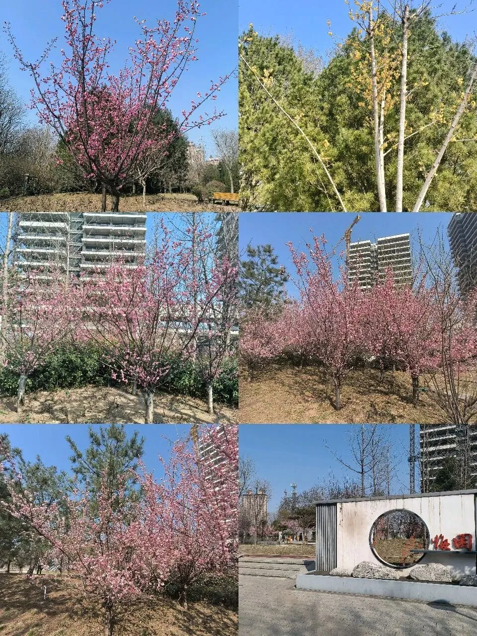 从梅园出来,如果时间充裕,还可以继续东行200米左右到月季公园转转。不过,现在的月季园里的月季并没有开花,只在公园的东北门处有两棵树开着粉色的花(分不清是桃花还是梅花)。