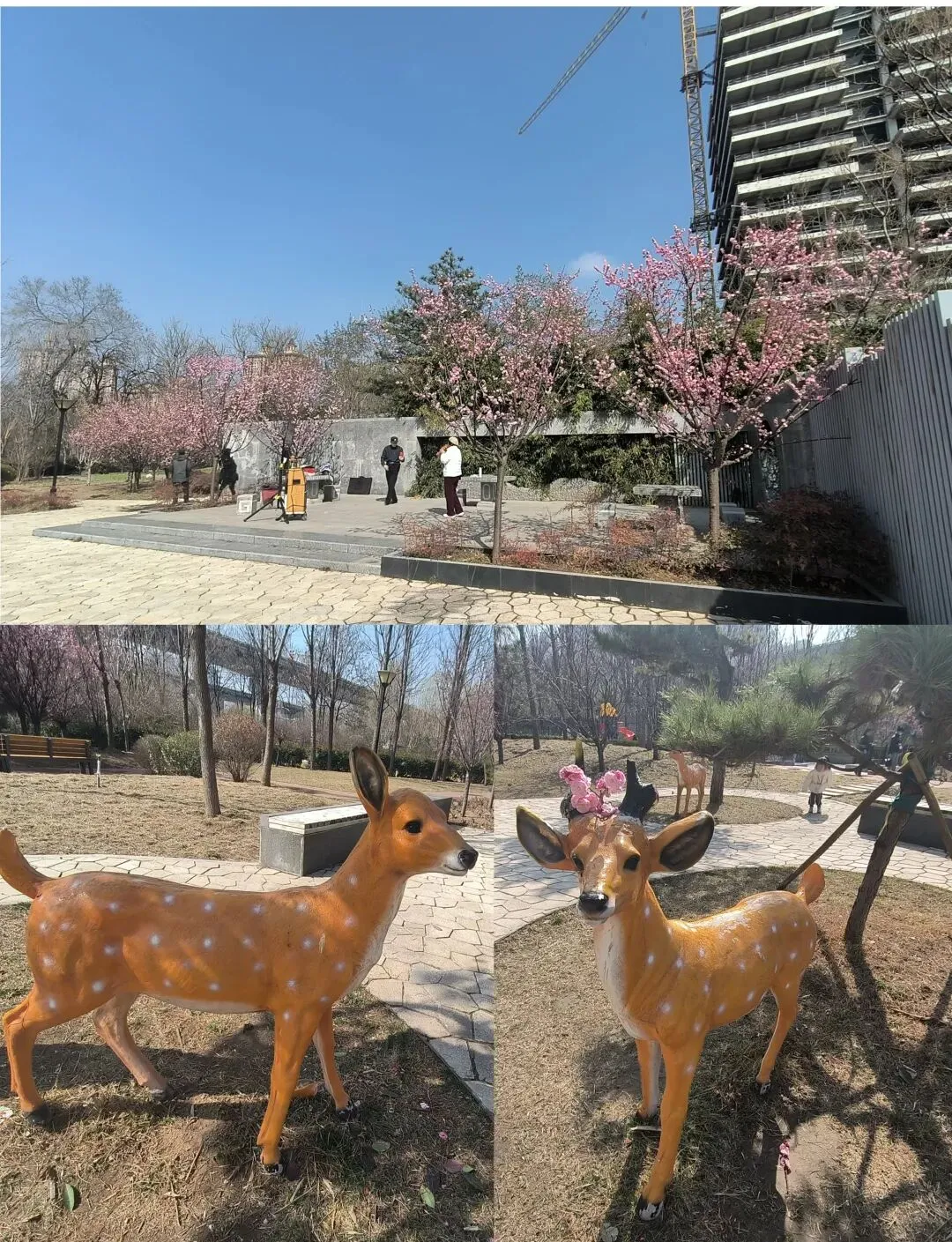 园内有一个小广场,那里有爱好唱歌的人士正在“引吭高歌”,周围的梅花和两只梅花鹿(泥塑)似乎也在为他们的歌声而陶醉、喝彩。