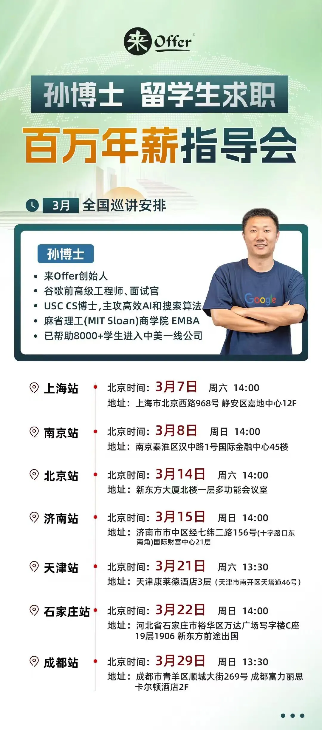 想和孙博士线下交流吗?准留学生出国前如何提前准备求职?大一/研一入学就能拿到谷歌/亚马逊实习offer的秘诀是什么?