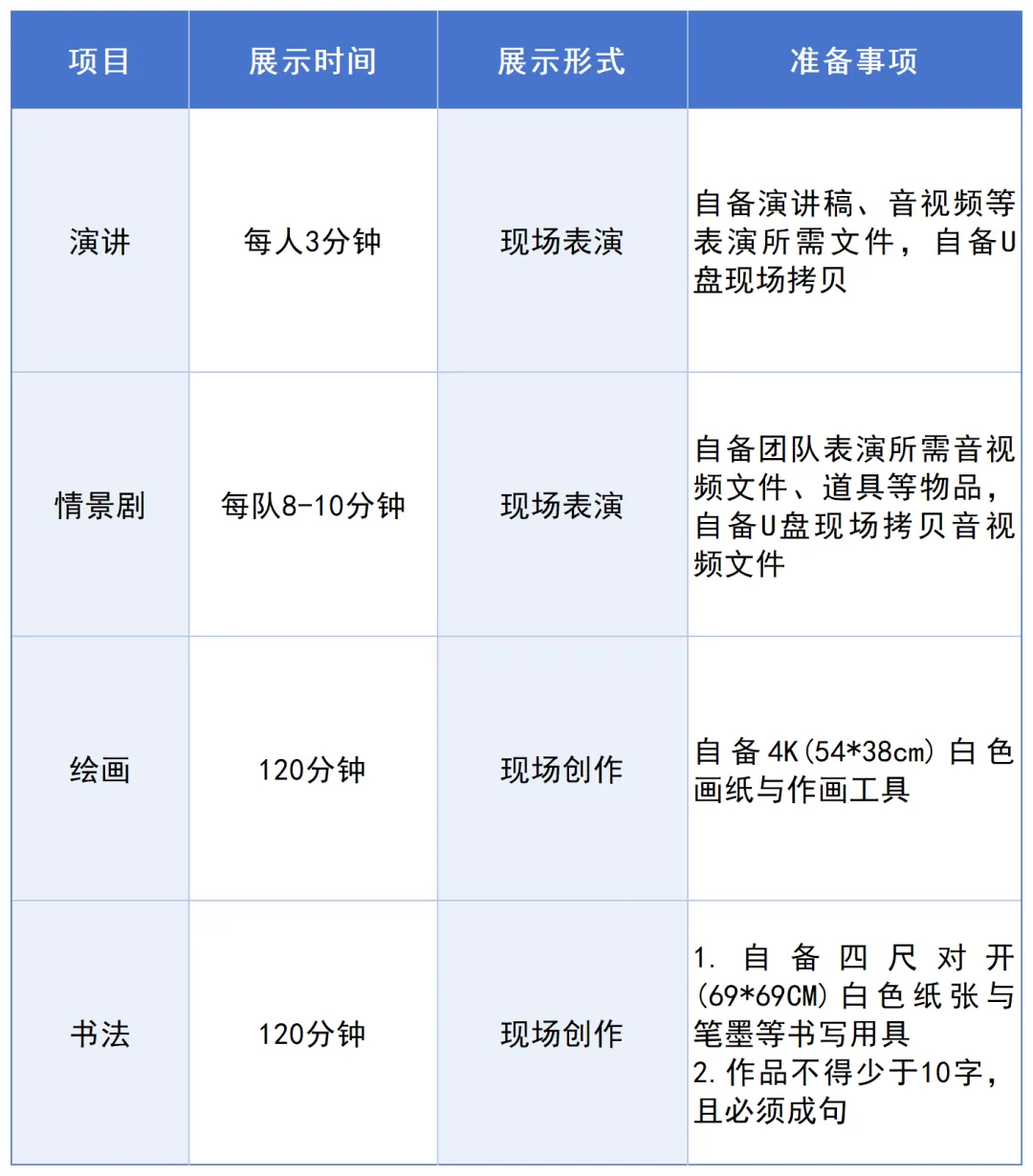 活动包含演讲、情景剧、绘画书法三个项目,各项目准备事项要求如下: