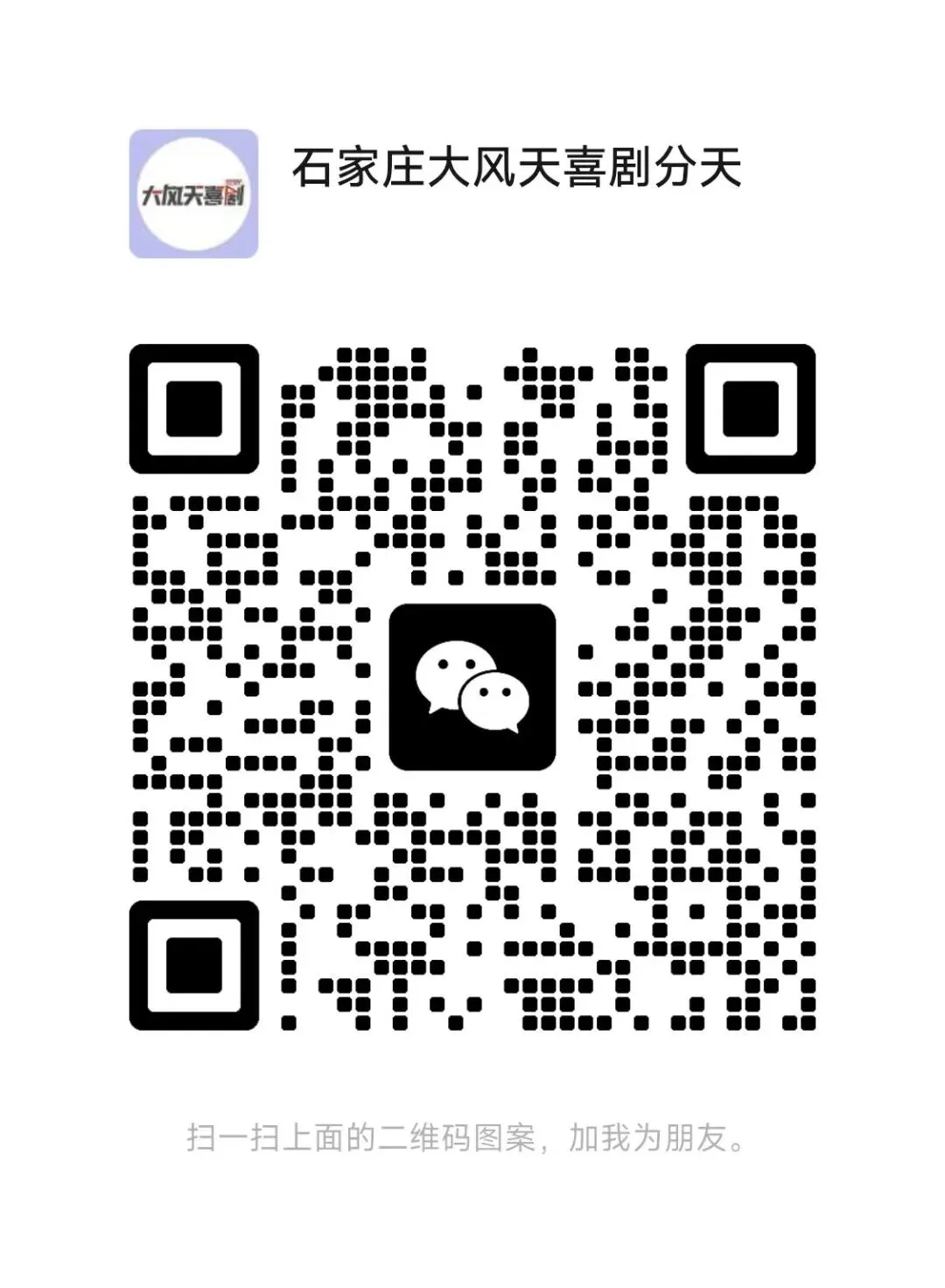 想要进入大风天喜剧石家庄观众群的朋友,可以添加石家庄大风天喜剧客服微信,回复“进群”,即可了解一手演出动态!