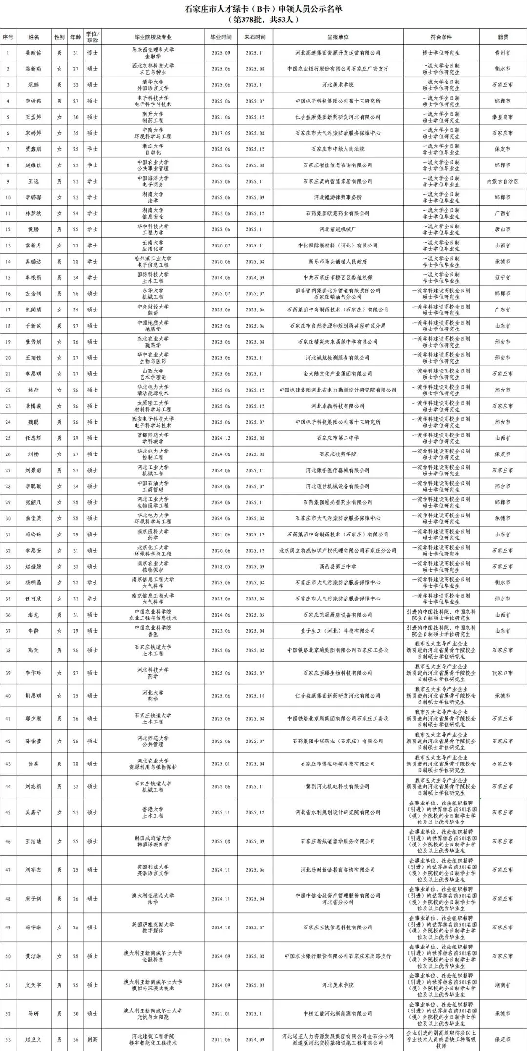 根据《石家庄市人才绿卡(B卡)管理办法(试行)》规定,经过本人申请、网上预审、单位审核、资格复审,拟为申请对象发放人才绿卡(B卡)。