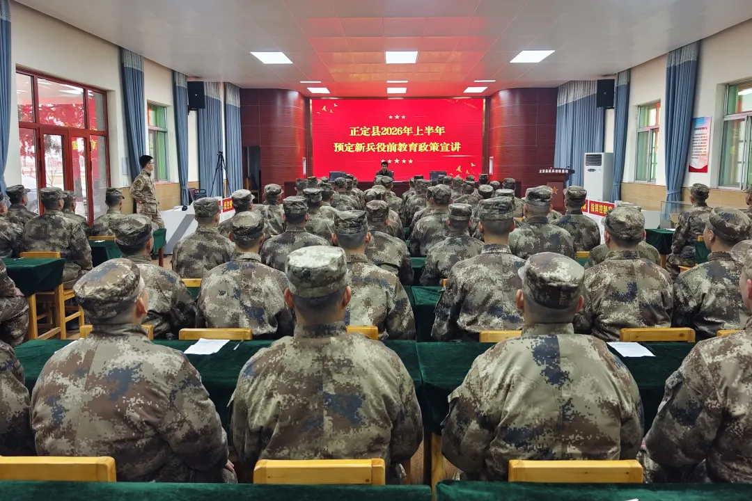 正定县在县民兵训练基地对2026年上半年预定新兵开展役前教育政策宣讲,让“准新兵”们吃下“定心丸”,安心入伍、报效祖国。通过宣讲,勉励役前集训的预定新兵进一步坚定政治意识,磨炼顽强意志,尽快融入部队大熔炉中,在部队要不怕困难、勇于吃苦,听从指挥、严格要求,爱军习武、提高本领,扎根军营、建功立业,争取早日成为一名政治合格、军事过硬、作风优良的合格战士。