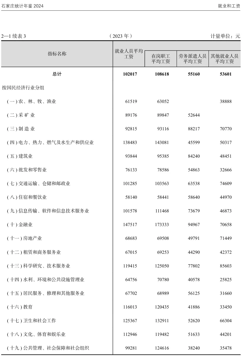 2023年石家庄市城镇单位就业人员年平均工资情况(2024年6月19日发布)