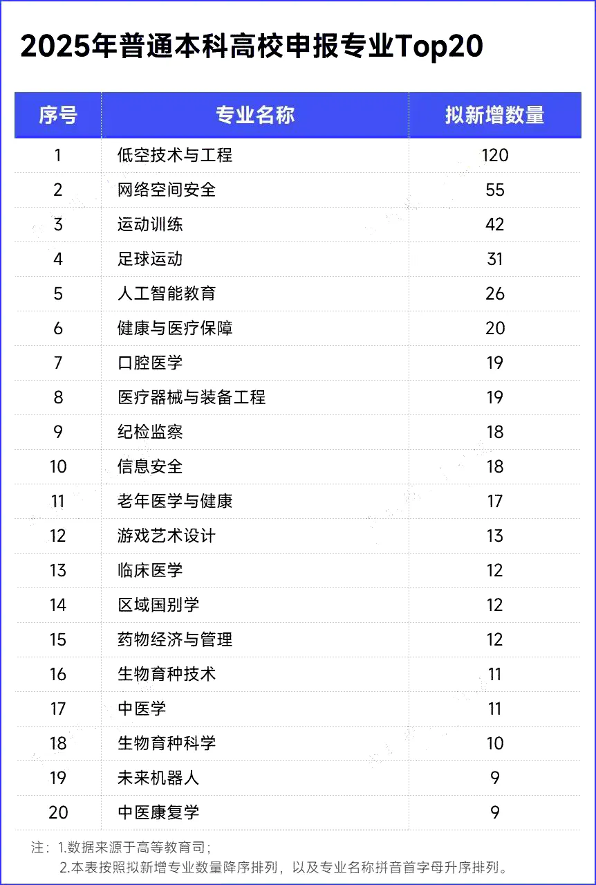 据统计,本次申报专业拟新增863个。从申报的专业类型来看,2025年度共申报239种专业。申报最多的前三个专业为低空技术与工程、网络空间安全和运动训练。其中,低空技术与工程拟新增数量最多,为120个;网络空间安全次之,拟新增数量为55个;运动训练拟新增数量为42个。那么,你知道申报最多的这三个专业学什么,毕业后可以从事什么样的职业吗?赶紧来看!