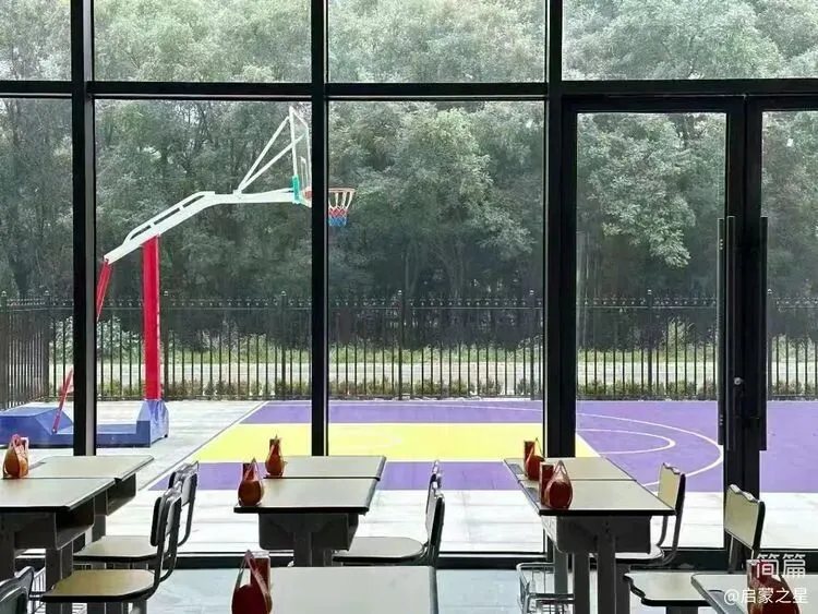 学校还设有开阔明亮的餐厅,提供营养均衡的餐食,让考生在学习之余能享受美味。室内摆放着椅子和洗衣机,生活设施齐全,为考生提供便利。从室内还能看到室外篮球场及周边景象,学习之余可以放松身心。