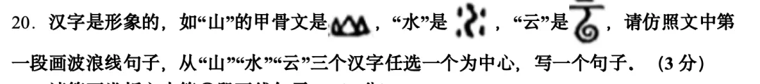 【解析】解题时需紧扣题干“仿照文中第一段画波浪线句子”的要求,先分析原句结构:“譬如凭空写一个‘X’字,两个四字叠词,一切(意象),就(动词)其中了”。仿写关键在于抓住汉字原始字形的视觉特征,通过叠词强化形象感,用动词衔接字形与意象内涵。