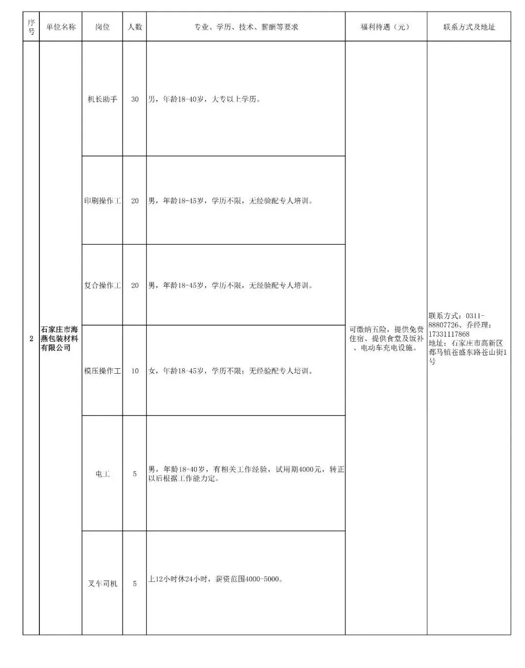 3.招聘简章电子版。(需写清楚岗位名称、招聘人数、任职要求、薪酬待遇、联系方式和地址)并将上述资料一并发送至邮箱:jygzggyx@126.com区就业服务中心将对用人单位资质进行严格审核把关,梳理汇总用工信息,并第一时间通过“石家庄高新发布”微信公众号、河北公共招聘网和基层劳动保障服务站(社区群)发布招聘详细信息,促进就业搭建平台,扎实推进高质量充分就业。咨询电话:0311-85098365特别提醒广大求职者:用人单位在招聘人员时,以任何名义收取风险基金、抵押金、保证金、保密费、培训费、体检费,以及以其他名义向求职者收取费用,扣押求职者的居民身份证和其他证件,要求求职者提供担保等行为均属于违法行为,如发现发布的单位存在以上违规行为的可拨打0311-85098365向就业服务中心反馈。