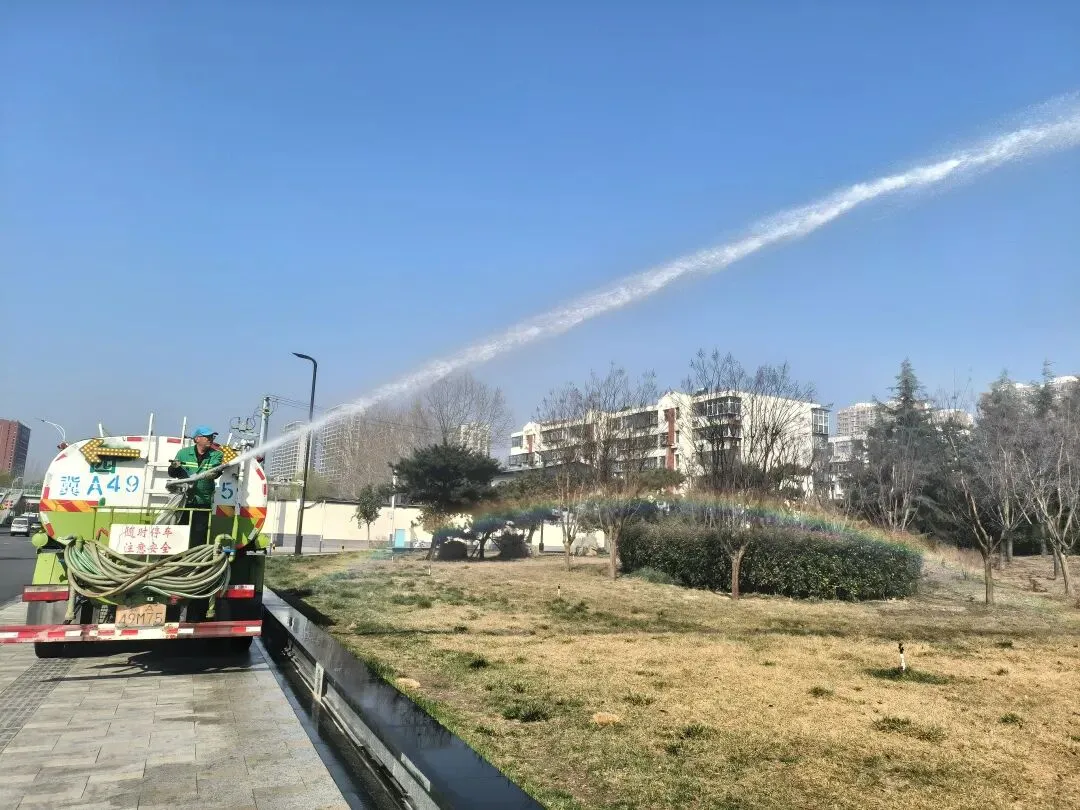 这次是坐2环2路到柏林公园站下车的,当时正赶上环卫工人给绿化带浇水。师傅站在水车上,手举着水枪喷水,喷出的水如一道射线,又像是“飞机拉线”,在阳光的照射下,竟然形成了一道七色彩虹🌈,煞是好看。
