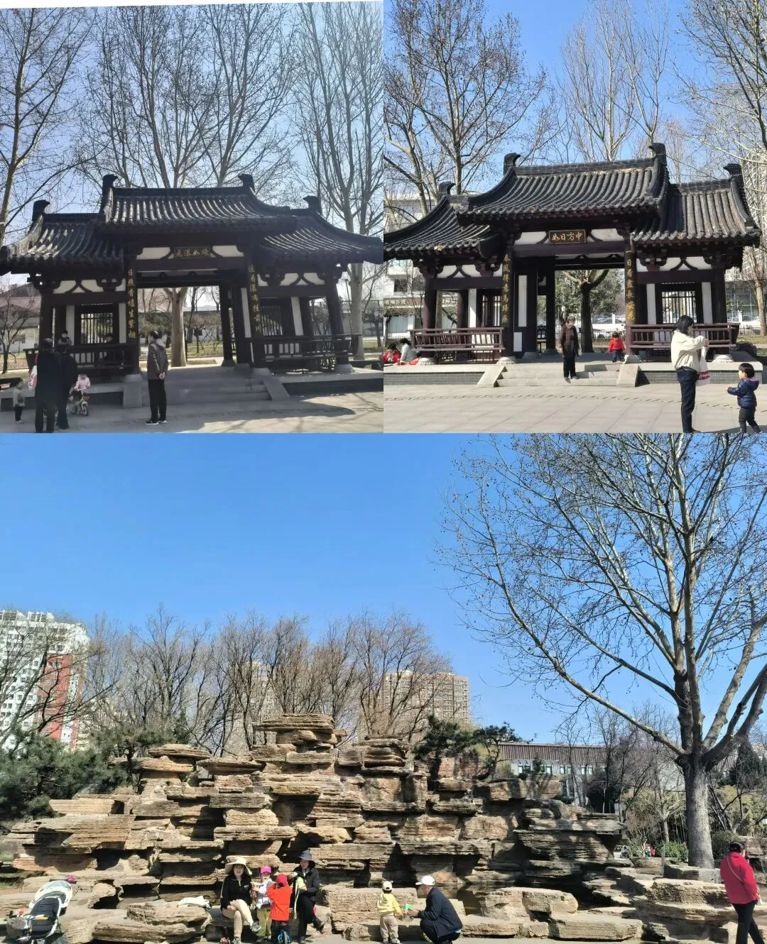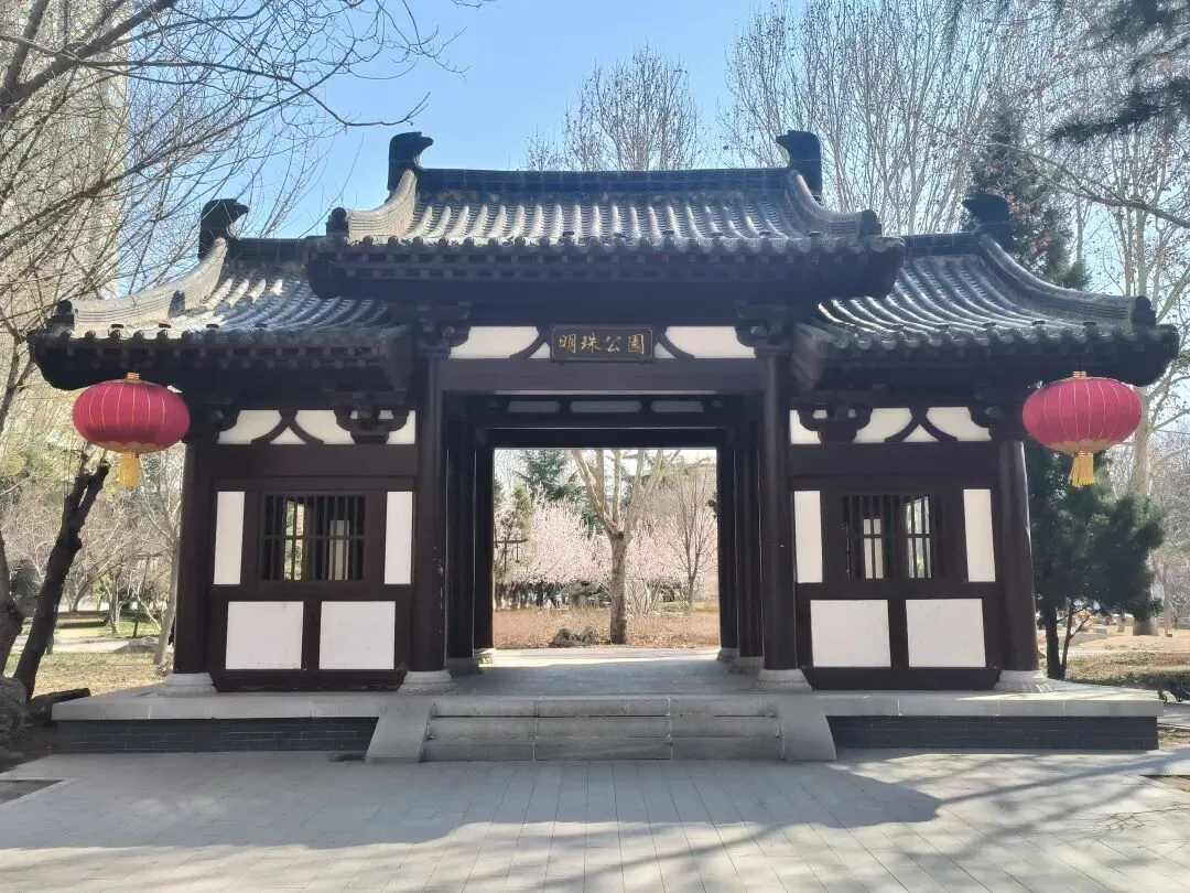 明珠公园的西门口也有一座门廊,从门口望向园区,就能看到盛开的桃花。门框就像画框把桃花盛开的美景装入画框中,很美很有意境。