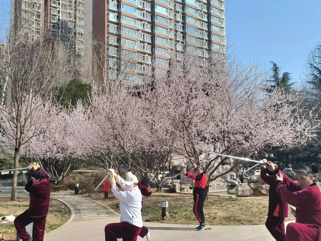 跳秧歌舞的几位大妈伴着音乐一遍又一遍地演练,还有练太极剑的、做八段锦的都在认真地做着每一个动作。