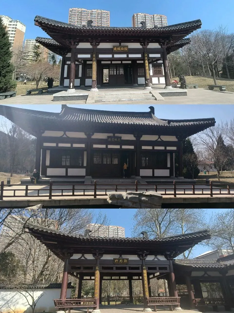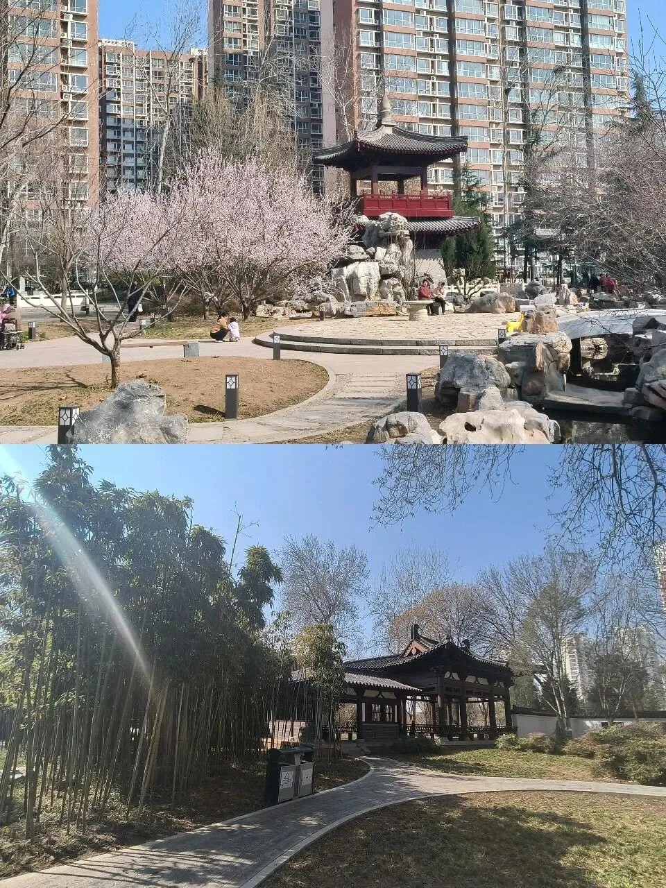 在公园的北部区域,有大片的竹林和几棵盛开的桃树,比较养眼。竹林茂密、桃花艳丽,再有古式建筑长廊坐落其中,给公园的景色增添了一些文化气息。