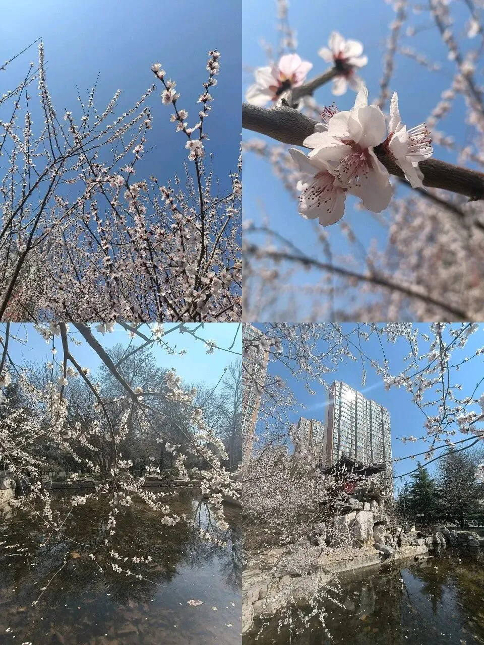 尤其是那几棵观赏桃树(具体名称不知)开的正盛,朵朵桃花粉中透白、娇艳欲滴,仿佛是春天特意给大地准备的粉色盛装,又有蓝天作画布,桃枝作画笔,把桃花随意撒向天空,挂满枝头,就是一幅漂亮的水粉画。