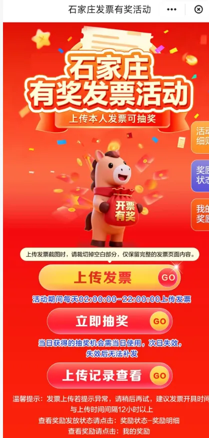 2月11日,石家庄市启动“有奖发票”促消费活动。活动总奖金规模达2.6亿元。活动期间,个人消费者在零售、餐饮、住宿、旅游等领域消费并开具符合规定的电子发票,即有机会参与抽奖,单张发票最高可获800元电子红包。 本次活动由石家庄市人民政府主办,市商务局、财政局、税务局等多部门联合承办,旨在通过发票抽奖形式鼓励消费者索取发票,规范市场秩序,促进消费增长。●活动时间与范围