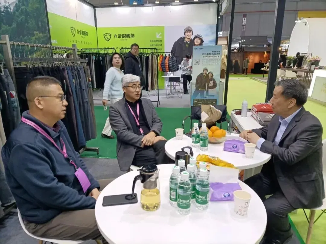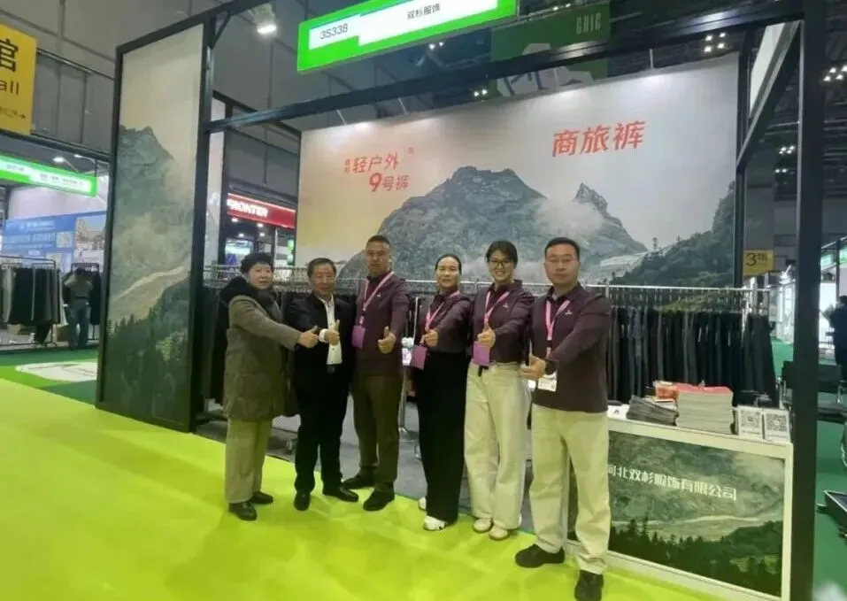 中国服装协会专职副会长杨晓东(中)在河北双杉服饰有限公司展位上巡馆指导。河北双杉服饰有限公司带来了2026春夏全系新品参展,以完整的产品矩阵回应市场的多元需求。每一款产品,都选用一线品牌面料精心打磨,都搭载着双杉国家专利U型裆技术,都经过反复推敲才呈现于展台之上。3天展期,与数百家客户进行了深度交流,新增意向客户超30家,众多客户当场下单试销。
