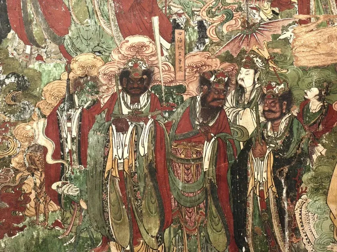 面对壁画,右侧下层是"四海龙王等众",此组共绘有四位龙王,两位侍者,四名水兽海怪。四位龙王居中相互顾盼,神态各异,其中一位龙王做回首状与身穿墨绿色长袍的龙王在窃窃私语,仿佛在商量着什么,二王身后立一白衣文官,面目清秀,左侧一红衣束发侍者执幡伞高举。其左下有一扇贝海妖肩扛红珊瑚毕恭毕敬地候着;另一龙王双手紧紧持笏板,头部稍低面色凝重,心事重重的样子,左上方有一个周身绿色的水兽托红盘,盘中的夜明珠发出一道耀眼的强光,右下一个蟾蜍状的海怪双手托海螺容器,内有稀世珠宝,发出幽幽柔美的光线,与画面上层的直光上下呼应;最后一位龙王是龙首人身,被安排在整组画面的最右侧,他双手托绿色宝瓶,瓶内插一支红珊瑚,头扭向左方怒目而视,仿佛对自己没被画成人首而愤愤不平,右侧身下一名水兽做随时待命状。整组画卷线条流畅、行云流水、层次分明、结构紧密。设色艳丽,以朱红、石绿为主,加以黄的点缀和黑的搭配使整个画面大气十足,艳而不俗。往上一层有“鬼子母等众”。相传古代王舍城有佛出世,众人赴会庆贺,遇一怀孕女子随行,不料中途流产,而五百人皆舍她而去。于是女子发下毒誓,来生要投生王舍城,食尽城中小儿。后来她果然应誓,捕捉城中小儿食之。佛祖闻听此事,趁其外出之际,藏匿她一名儿女。鬼子母回来后遍寻不得,最后只好向佛祖求助。佛祖劝她将心比心,弃恶从善。鬼子母终于痛改前非,转而成为孩子们的保护神。“地藏王菩萨”共绘五人,地藏王居中,一手托明珠,一手握金锡,可谓是:手中金锡震开地狱之门,掌上明珠光摄大千世界。地藏王菩萨左边是比丘道明,右边是居士闵公,后排是两位手持经卷的侍女。闵公和道明是一对父子,闵公是一位乐善好施的人,家住九华山。闵公经常斋请供养高僧,一日地藏王菩萨路过此地,想借袈裟大的一块地方修行,闵公欣然同意,谁料想地藏王抛出的袈裟罩住了整个九华山,闵公见后大喜,拱手让出了九华山,并舍了他的儿子出家,就是后来的道明和尚。后来闵公也潜心修行,拜儿子为师,成为受戒居士,从此追随在地藏王左右。