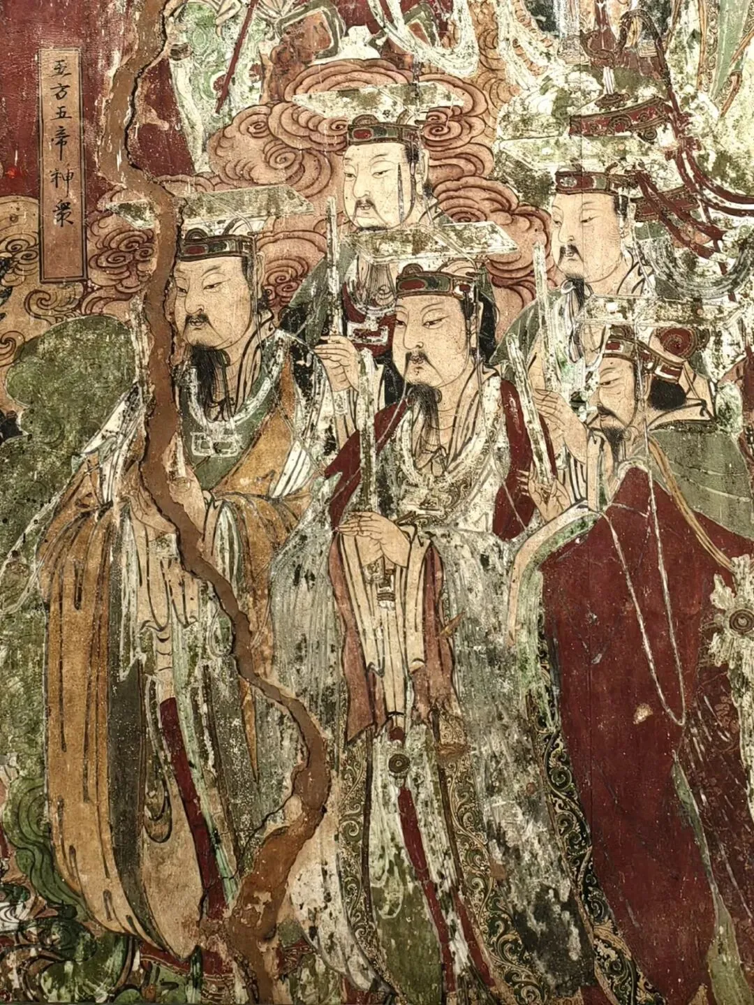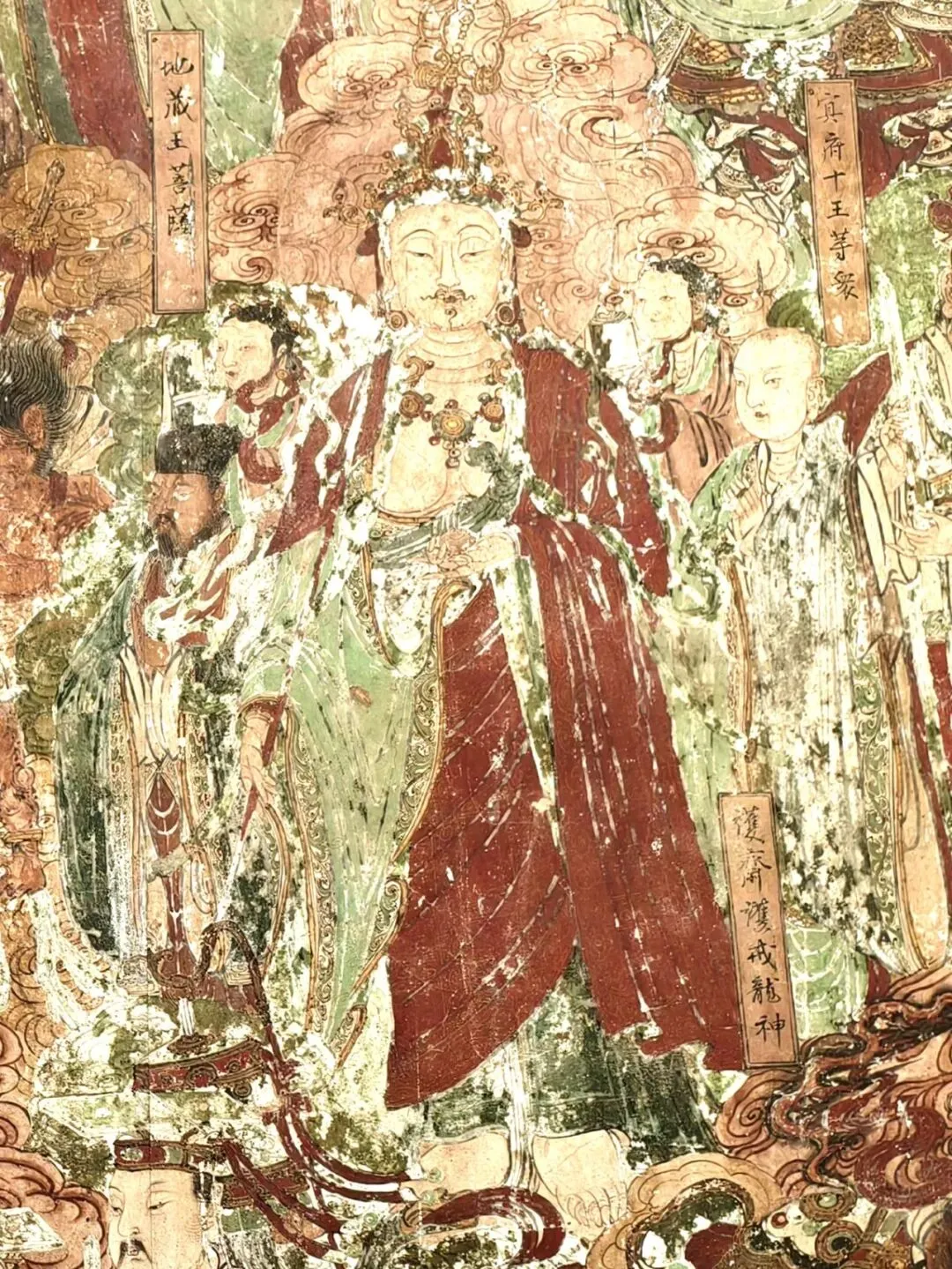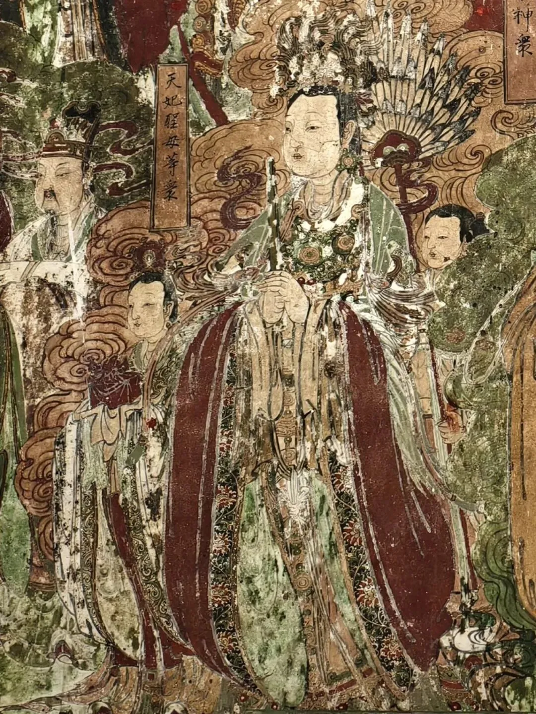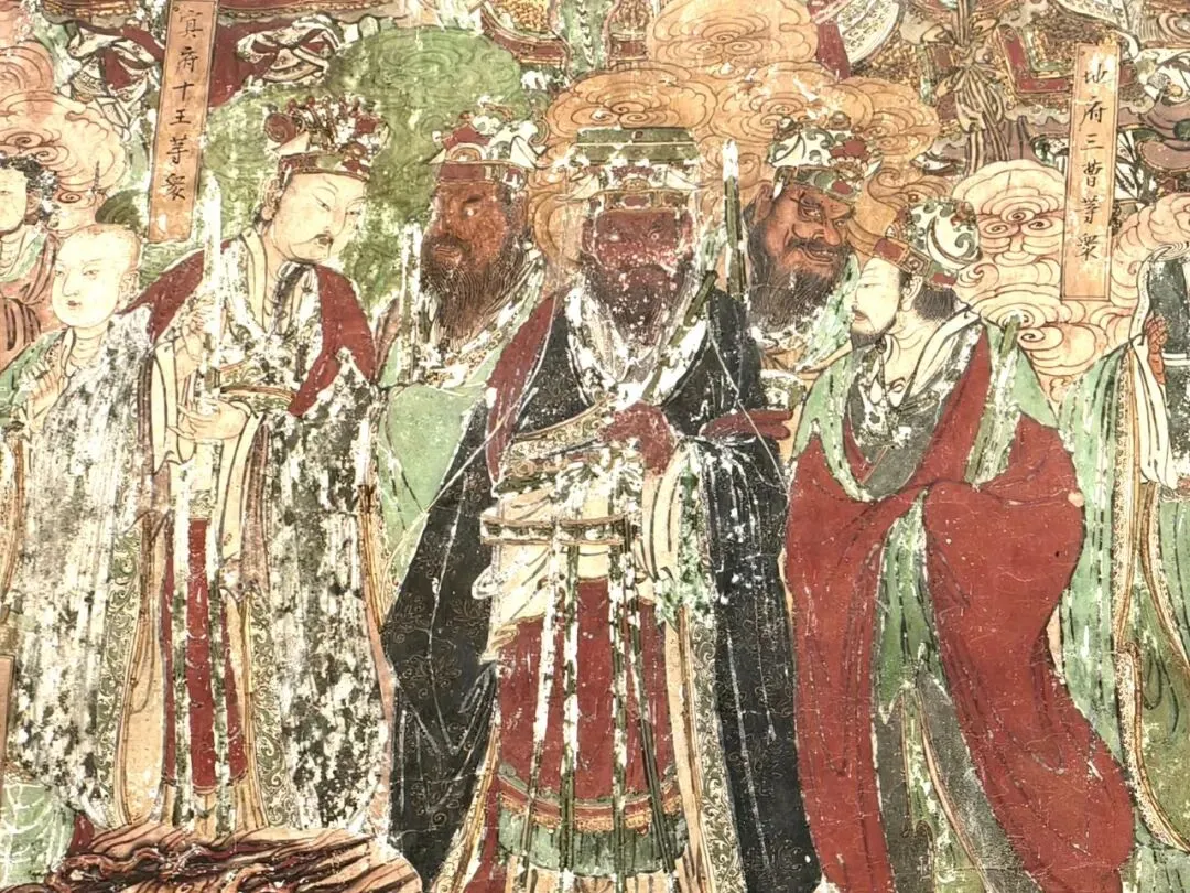 “地藏王菩萨“旁边是“冥府十王等众”。在壁画艺术创作中,冥府十王经常与地藏王菩萨作为一个主题相伴出现。天妃圣母是民间广为流传信仰的海神妈祖,和众多神众不同的是,妈祖在历史上确有其人,是真实存在的。“天妃圣母等众”共绘三人,画像中妈祖居中心,双手握笏板,凤冠霞披,袖口花边黑底红花,高贵华丽。面目端庄秀美,眼神深邃,透着一种淡淡的神伤和忧虑,仿佛在凝视远方的大海,为那些航海者和渔民祈祷祝福,保佑他们平安归来。妈祖身旁是两位侍女,身材娇小、灵秀可人,左侧侍女执伞,右侧侍女捧印。