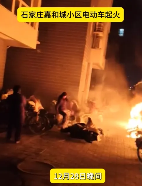 火情概况:河北石家庄嘉和城小区2号楼一单元门口自行车棚突发电动车起火,火势快速蔓延至周边多辆电动车、自行车,现场浓烟密布。