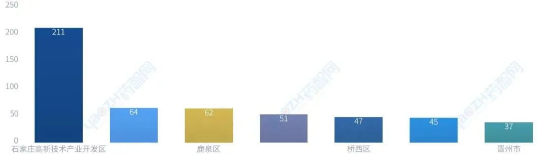 从企业区域分布情况看,石家庄市生物医药产业企业数量排名前十区域如下:石家庄高新技术产业开发区211家,栾城区64家,鹿泉区62家,藁城区51家,桥西区47家,正定县45家,晋州市37家,新华区34家,裕华区34家,新乐市31家。排名前五的区县生物医药企业数量约占全市总数的55.06%,排名第一的石家庄高新技术产业开发区生物医药类企业数量约占全市总数的26.71%。