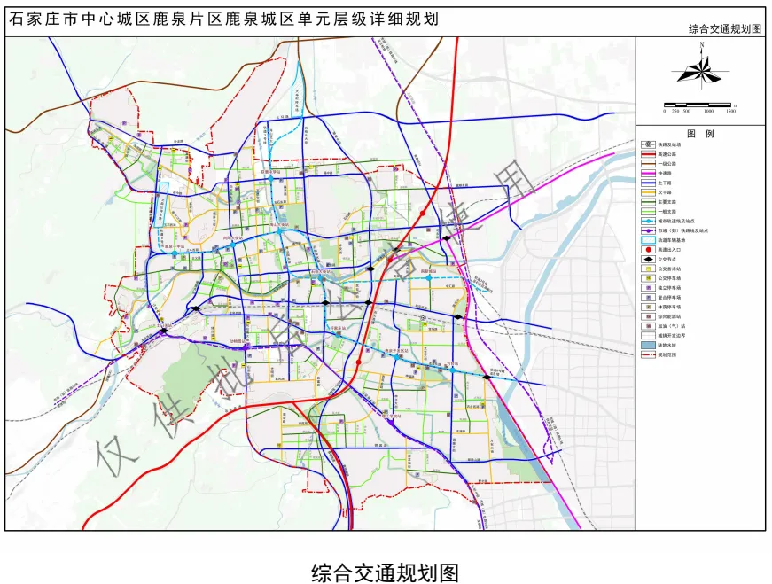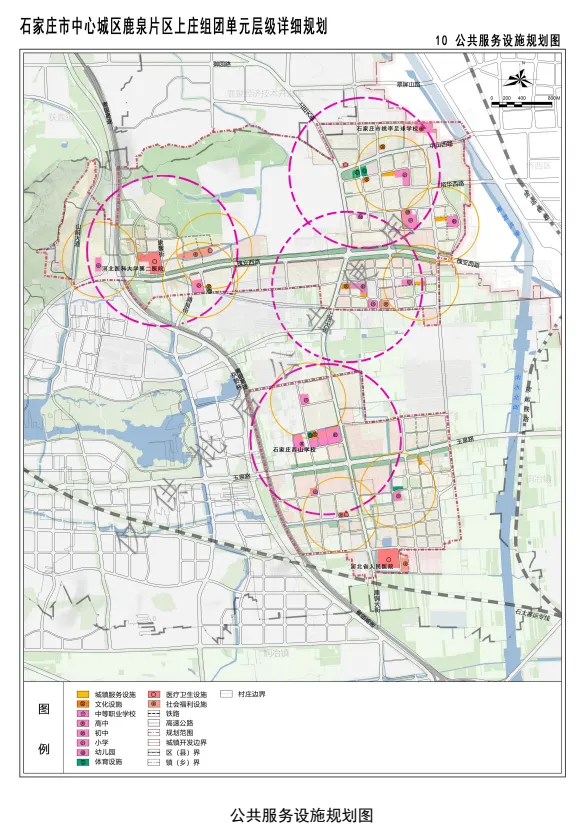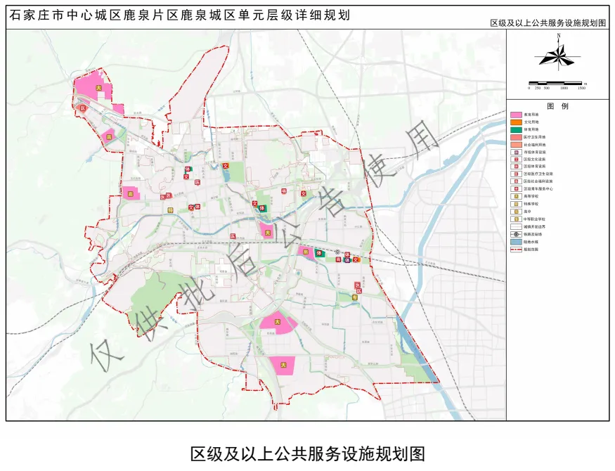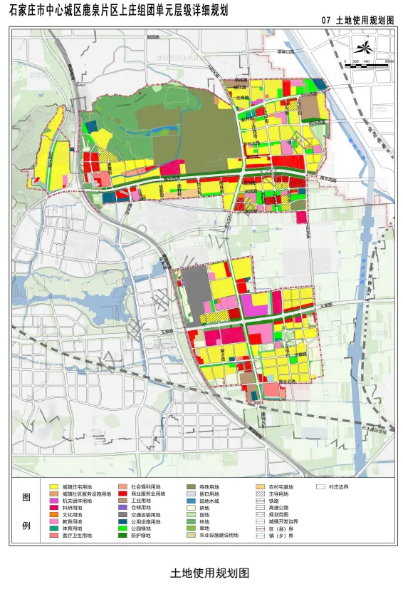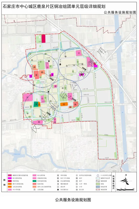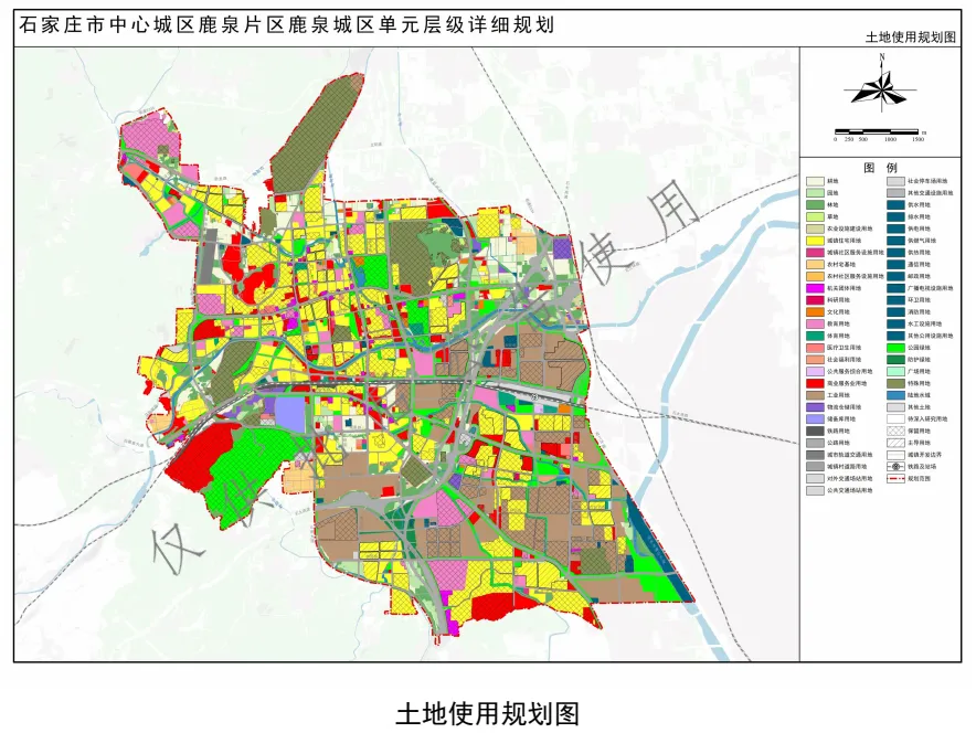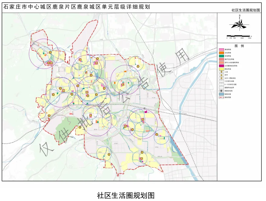 鹿泉城区规划常住人口规模约 33 万人左右,用地规模约5607.07 公顷,其中城镇开发边界内用地约 4228.04 公顷。以建设高品质山水花园城区为目标,以高质量推动产城景融合为导向,形成“三带三轴、三心三片”空间结构。“三带” 即太平河休闲风光带、山前文旅休闲带和环城水系生态带;“三轴”即龙泉东路、北斗路融城发展轴和石柏大街区域一体化发展轴;“三心”即老城综合服务中心、新城活力中心、产业服务中心;“三片”即老城片区、新城片区、开发区片区三个城市片区。合理引导居住用地布局,有序推进城中村改造,合理引导居住用地和商业、办公用地混合布局,促进职住平衡。落实总体规划传导的各项市、区级公共服务设施,优化公共服务设施布局;结合城市更新补足社区级文化、体育、养老和基础教育设施,保障市民基本需求。优化商业用地布局,加强商业设施集聚,提升大型商业和特色商业服务功能业态,打造区域商业中心。优化产业用地布局,引导工业用地向新一代电子信息产业园内集聚,仓储用地向石太铁路沿线集中,推动低效产业用地再利用。落实总体规划对鹿泉城区内的道路系统、交通设施的控制要求,提高次支路网密度;落实专项规划确定的城市轨道交通线网和站点布局。落实上位规划确定的重要市政设施、综合安全防灾设施,保障其建设空间,鼓励市政设施用地复合综合利用。提升石家庄市动物园、海山公园、全民健身中心公园等重要城市公园品质,结合城市更新重点增加社区公园、游园,提升沿河、沿路绿带质量与连通性。按照“应划尽划”原则,结合鹿泉城区产业实际,共计划定工业用地控制线约 605.53 公顷。鹿泉城区内共划定13个详细规划编制单元,单元规模为3~6平方千米,单元名称为 LQ-03~LQ-15 单元。LQ-03 单元主导功能为居住生活、综合服务;LQ-04 单元主导功能为居住生活;LQ-05 单元主导功能为居住生活;LQ-06 单元主导功能为居住生活、综合服务;LQ-07 单元主导功能为居住生活;LQ-08 单元主导功能为综合服务、工业;LQ-09 单元主导功能为工业;LQ-10单元主导功能为商业商务、文旅休闲;LQ-11 单元主导功能为居住生活、工业;LQ-12 单元主导功能为居住生活、工业;LQ-13单元主导功能为工业;LQ-14 单元主导功能为居住生活;LQ-15单元主导功能为工业。规划落实轨道 3 号线和 8 号线、市域(郊)铁路 S5 线和 S1线,为实现轨道交通与城市功能深度融合做好用地管控预留。规划道路系统由快速路、主干路、次干路、支路构成。快速路由西三环、北三环构成;依托卧龙路、北环路、福中路、富顺东路、北斗西路-北斗东路、会馆路、和平西路、龙泉西路- 龙泉东路、观景路、御园路、翠屏山路、山前大道、石东路、翠屏大街、向阳北大街-向阳南大街、海山北大街-海山南大街、石柏北大街-石柏南大街、翠柏大街-京赞线、申兴大街、省道S534-花东街、昌盛大街、青银辅路,形成“十一横十一纵”的主干路网。7.公共设施