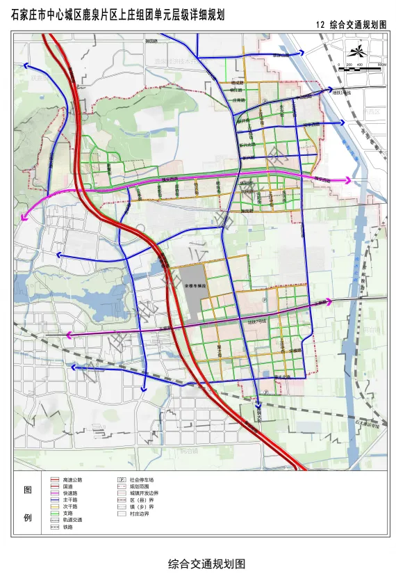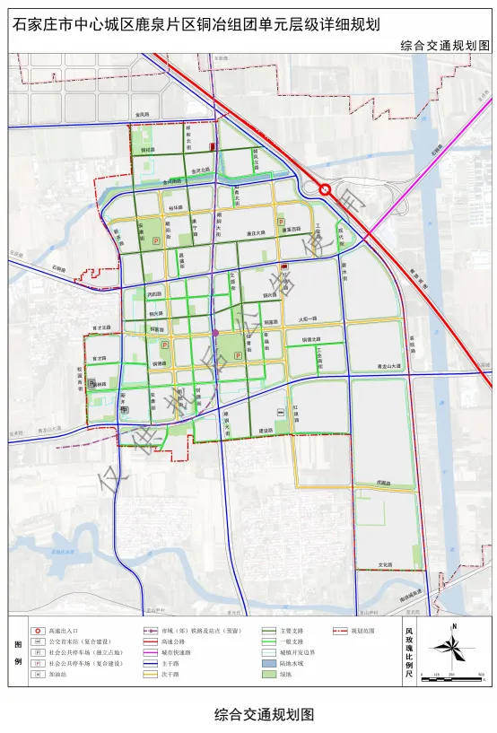落实总体规划国省干线公路网,包括高速公路 G20(青银高速)、国道 G234(京赞线)。落实市域(郊)铁路 S5 号线、地铁 1 号线、地铁 7 号线,为实现轨道交通与城市功能深度融合做好用地管控预留。在延续总体规划干路网结构基础上,按照“小街区、密路网”规划理念,深化规划范围内次支路网系统,保障交通设施供给,构筑功能清晰,衔接顺畅的路网,规划道路系统由快速路、主干路、次干路、支路构成。槐安西路、玉泉路、中山西路、裕华西路、上庄大街(顺铜大街)、上庄东街等,构成“六横四纵”的快速、主干路网。