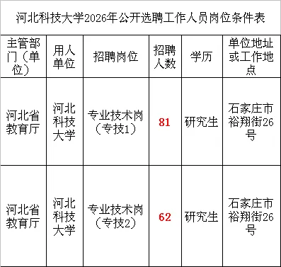 具体要求详见《河北科技大学2026年公开选聘工作人员岗位条件表》(附件)。其中专业参考教育部《授予博士、硕士学位和培养研究生的学科、专业目录》《普通高等学校本科专业目录》《普通高等学校高职高专专业参考目录(试行)》等设置。