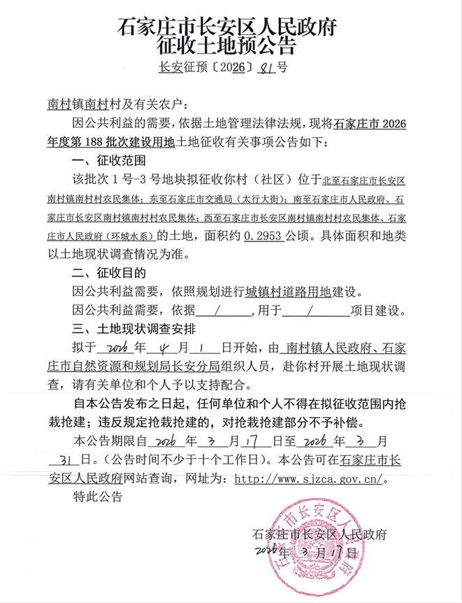 石家庄征收土地公告!