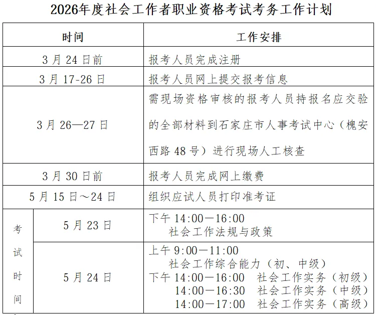 2026年度社会工作者职业资格考试定于5月23日、24日举行。辛集市报名考务管理工作由石家庄市考试管理机构负责。