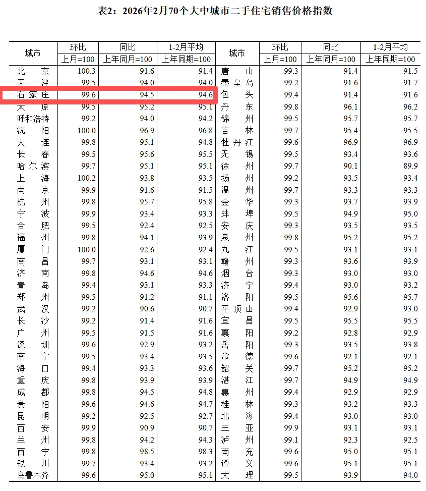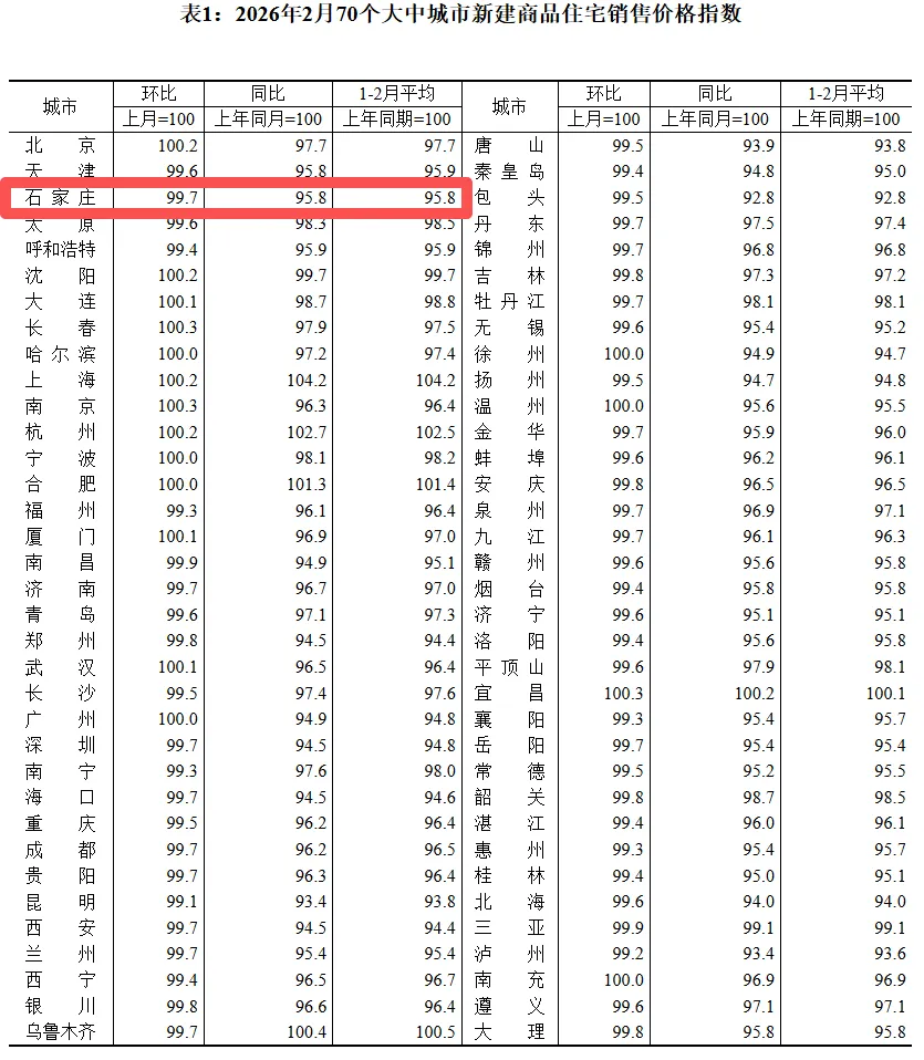 2026年2月份,总体看70个大中城市商品住宅销售价格环比降幅继续收窄、同比下降。新建商品住宅销售价格环比上涨或持平城市个数比上月增加。其中石家庄,2月新房价格环比下降0.3%,同比下降4.2%;二手房价格环比下降0.4%,同比下降5.5%。