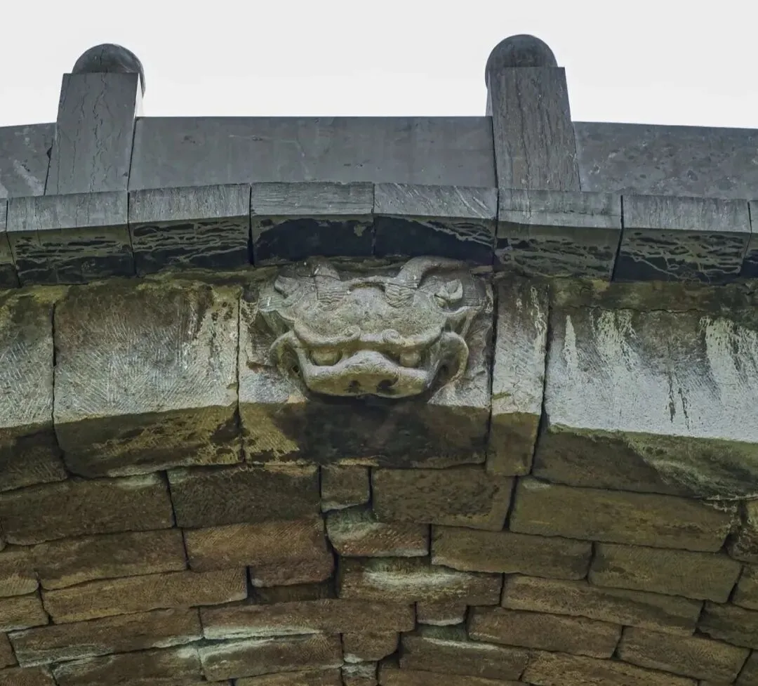 拱券正中吸水兽,怒目圆睁,镇守一方平安。
