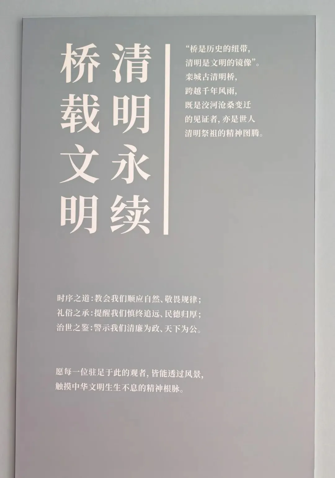 公园内还设有一个简易展馆,不仅介绍古桥历史,更深入挖掘“清明”二字的文化内涵,从自然节气延伸到对“政治清明”的古代理想,让这座桥的寓意更为深远。