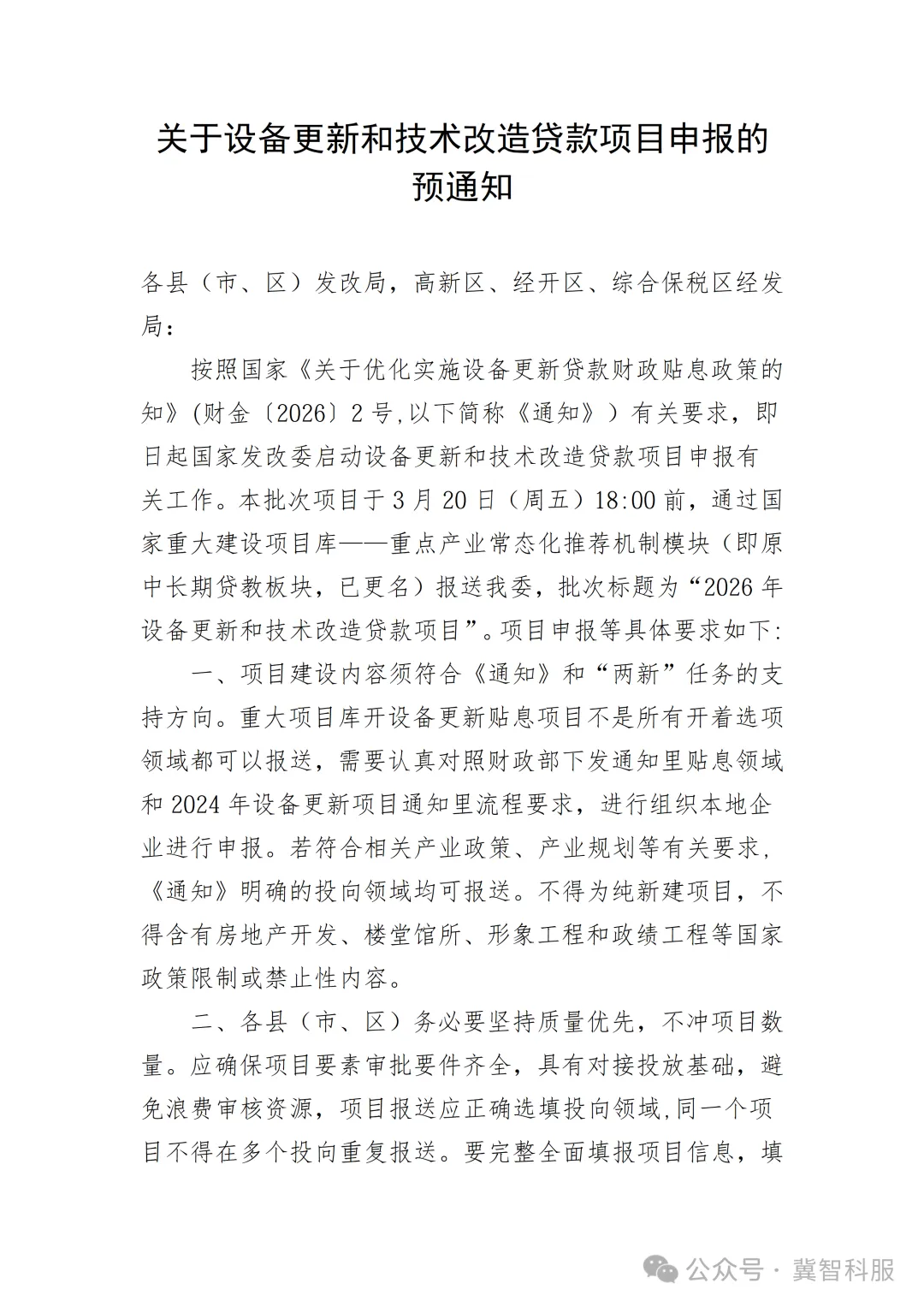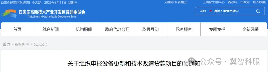 按照国家《关于优化实施设备更新贷款财政贴息政策的知》(财金〔2026〕2号)有关要求,即日起国家发展和改革委启动设备更新和技术改造贷款项目申报有关工作。请符合条件的企业于3月19日(周四)18:00前填报国家重大建设项目库——重点产业常态化推荐机制模块(即原中长期贷教板块,已更名)报送,批次标题为“2026年设备更新和技术改造贷款项目”。