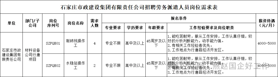 石家庄市政建设集团有限责任公司始建于1948年,隶属于石家庄国控城市发展投资集团有限责任公司,是具有78年历史的国有大型集团企业,主营业务覆盖市政工程,建筑工程,公路工程,热力工程,隧道工程,园林工程,城市及道路照明工程,污水处理建设和运营,混凝土制品生产·运输·销售;机械租赁,社区医疗卫生服务,建筑垃圾资源化,工程检测,社会经济咨询,房地产开发。公司具有市政公用工程施工总承包一级、房屋建筑工程施工总承包二级、公路工程施工总承包二级、城市及道路照明工程专业承包一级、桥梁工程专业承包二级、混凝土预制构件专业承包三级、“公用管道安装(GB2)”特种设备安装许可证等资质,年施工能力在50亿元以上。公司近年来承建省市重点工程二百余项,获得市政金杯奖、省优质工程、省样板工程、市优质工程等国家及省市奖项百余项,得到各级政府和领导的高度评价,在桥梁整体顶升、超长距离泥水平衡顶进、装配式施工、建筑垃圾资源化处置、分布式光伏发电等新技术、新工艺、新设备应用上取得了突出成绩,引领了行业发展。公司坚持以市场为导向,以科技为动力,以创新求发展,全力打造以市政和房建工程为主业,以建筑垃圾再生利用、新能源电力生产与供应、健康医疗服务,房地产开发为辅助的一主四辅产业结构。下设市政公司、园林公司、检测公司、政元供应链公司、市政医院等10个子分公司,公司从产品竞争提升为服务竞争,从价格竞争提升为价值竞争,从技术竞争提升为品牌竞争和文化竞争,逐步发展成为管理精细化、发展战略化、考核目标化、工程品牌化的市政建设集团。根据工作需要,现委托石家庄市国经人力资源管理有限公司面向社会公开招聘劳务派遣制人员。现将具体招聘事宜公告如下:招聘工作坚持德才兼备的用人标准和“公开、平等、竞争、择优”的原则,面向社会实行市场化公开招聘。
