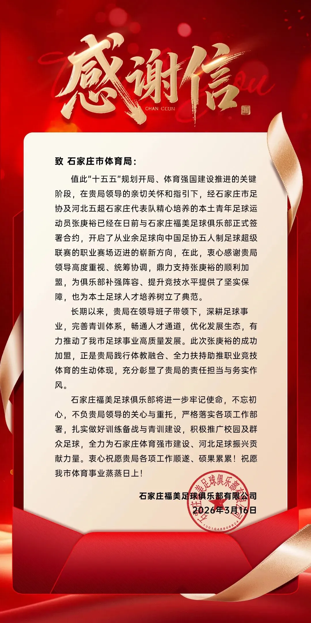 感谢石家庄、沧州两地体育局对石家庄福美足球俱乐部的大力支持!