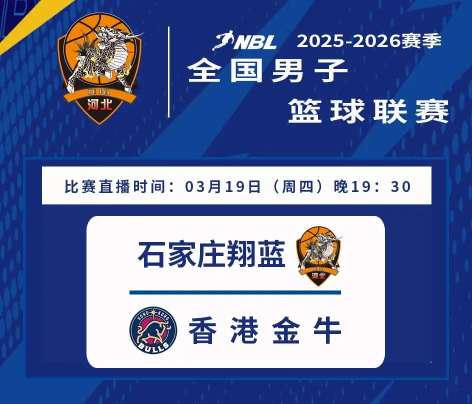 3月19日19:30,石家庄翔蓝将在本赛季NBL联赛第二十五轮比赛中,主场对阵卫冕冠军香港金牛。