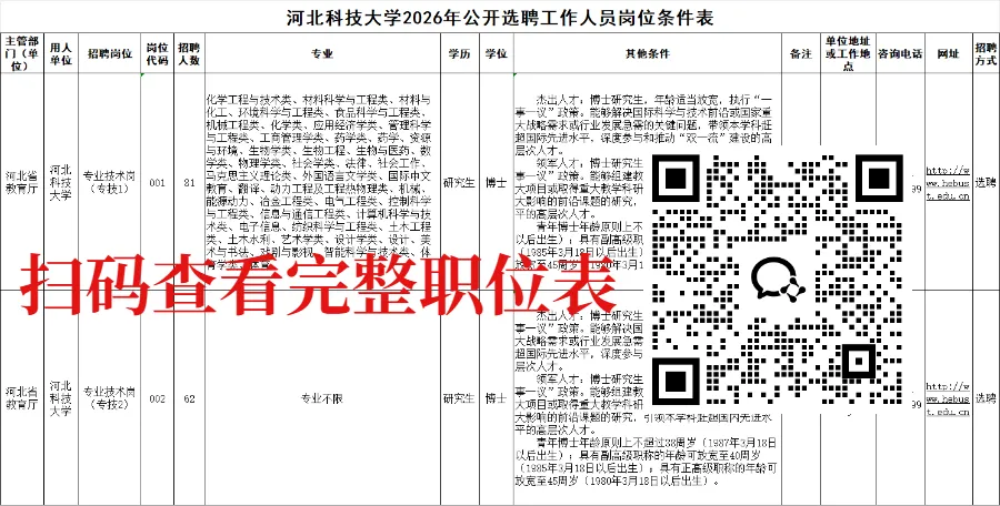 具体要求详见《河北科技大学2026年公开选聘工作人员岗位条件表》(附件)。其中专业参考教育部《授予博士、硕士学位和培养研究生的学科、专业目录》《普通高等学校本科专业目录》《普通高等学校高职高专专业参考目录(试行)》等设置。