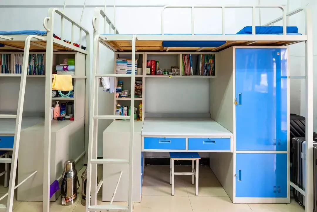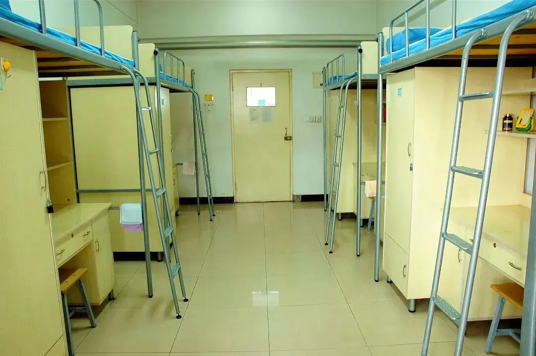宿舍标准6人间,两个宿舍阳台连着,有书桌,阳台两端各有一个卫生间,每层都有公共浴室。