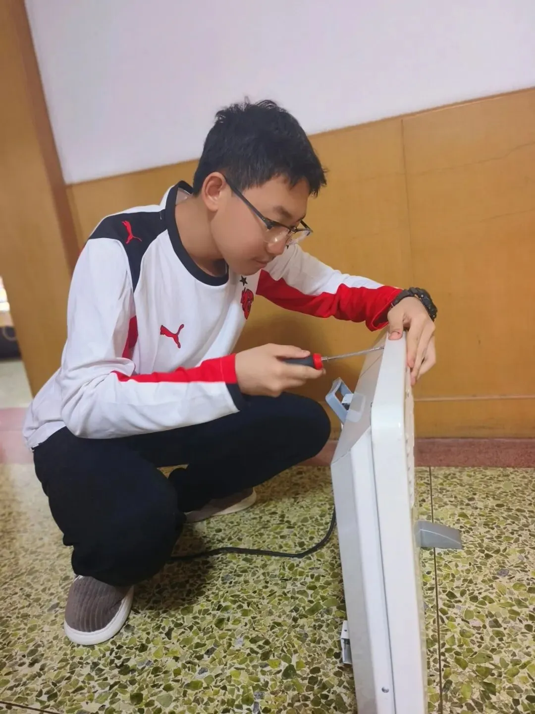 2025级3班周柄辰同学,发现家里的旧电暖气出了故障,便主动上手排查修理。两个多小时里,双手沾满黑印,腰腹酸痛难忍,却始终没有放弃。当电暖气成功亮起的那一刻,所有疲惫都化为安心。他提笔给父母写了一封信,郑重承诺:往后家里电器有故障,先找我!