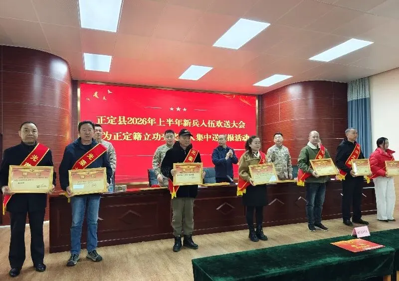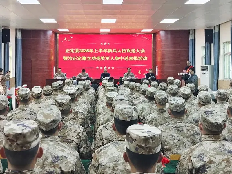 3月15日,正定县在民兵训练基地举行2026年上半年新兵入伍欢送大会暨为立功受奖现役军人集中送喜报活动。县委副书记、县长李万里,县委常委、县人武部政委陈荣翔,县人武部部长李国庆等出席,15名立功受奖现役军人家属代表、105名新兵及部分新兵家属参加活动。
