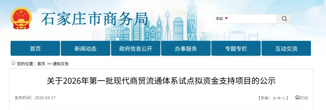根据《财政部办公厅 商务部办公厅关于支持建设现代商贸流通体系试点城市的通知》(财办建〔2024〕21号)和《石家庄市现代商贸流通体系建设项目验收工作方案》等要求,现对验收后2026年第一批现代商贸流通体系试点拟资金支持项目进行公示。公示时间为2026年3月17日至3月23日。如有异议,请在公示期内,以实名书面形式向石家庄市商务局如实反映情况。