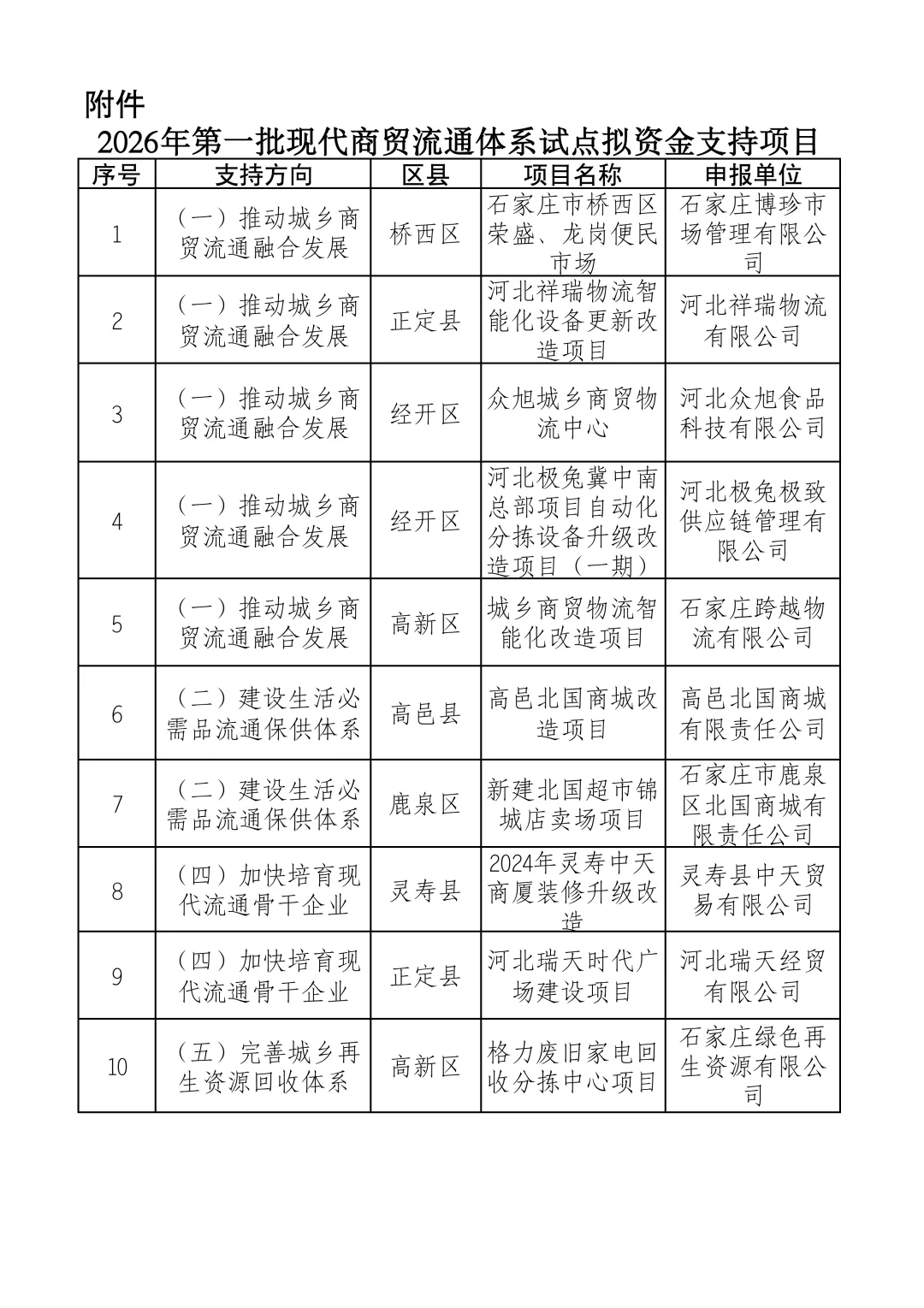 石家庄市商务局对2026年第一批现代商贸流通体系试点拟资金支持项目进行公示,详情如下: