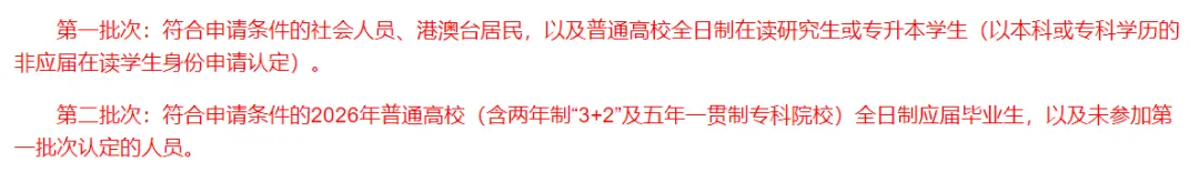 1.2026年普通高校(含两年制“3+2”及五年一贯制专科院校)全日制应届毕业生,可在户籍地或学校所在地,凭当年取得的学历,参加上半年第二批次认定申请。