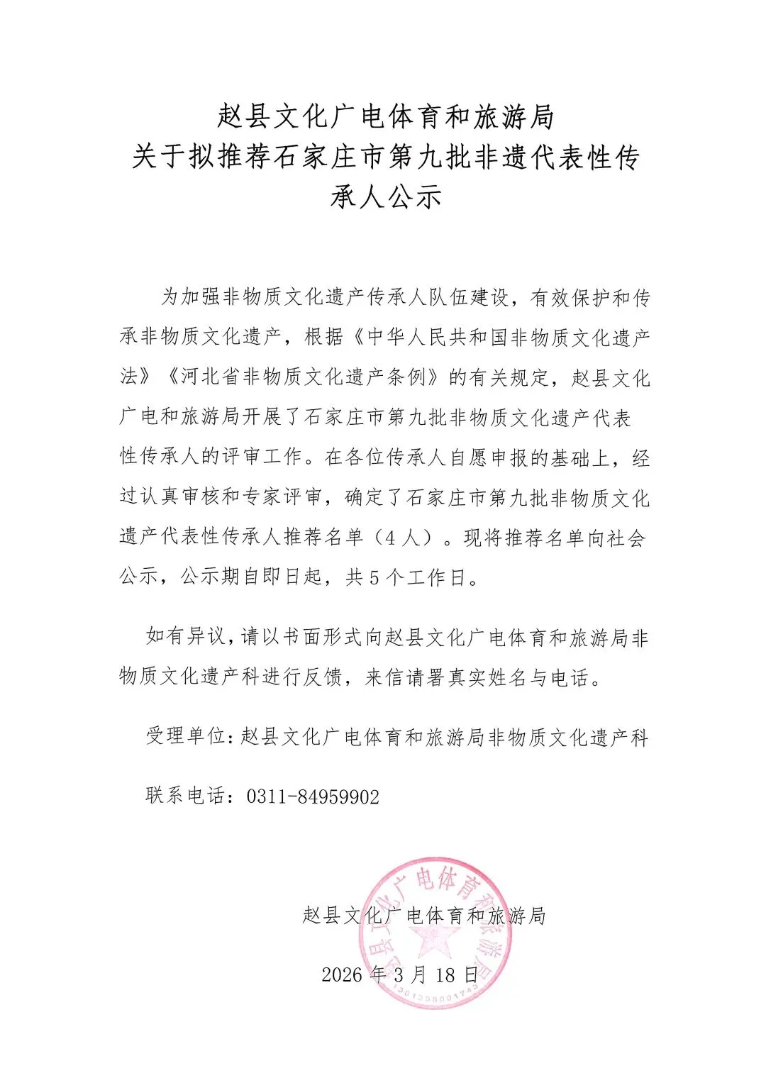 关于拟推荐石家庄市第九批非遗代表性传承人公示
