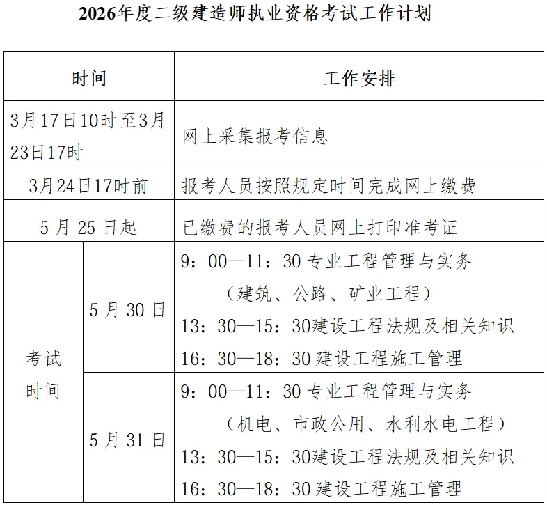 2026年度二级建造师执业资格考试时间定于5月30日、31日举行。辛集市报名考务管理工作由石家庄市人事考试中心负责。