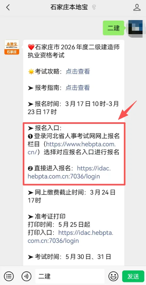 ✅也可关注【石家庄本地宝】公众号,私信回复【二建】,即可获取报名平台入口、报考指南、证书查询入口等