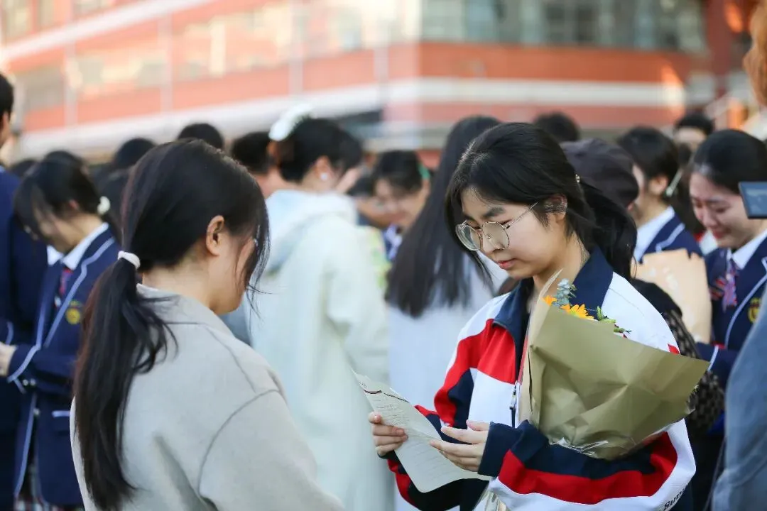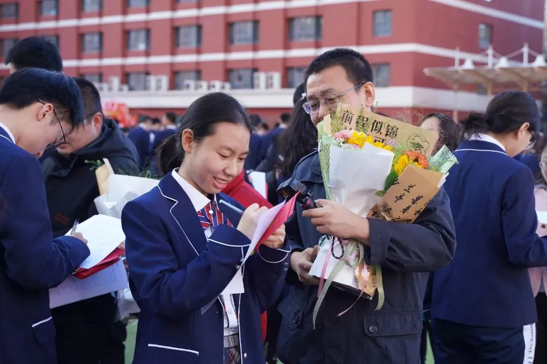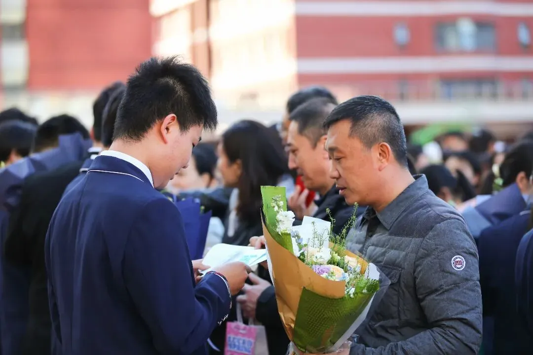 父母的期许,是成长路上最温暖的光。家长代表登台发言,语重心长的寄语里,有对孩子成年的欣慰,有对高考的美好祝福,也有对学校与老师们辛勤付出的诚挚感谢。随后的家书赠送环节,成为现场最动人的篇章,家长们亲手将写满牵挂与期盼的家书递到孩子手中,亲子面对面,指尖传温情,一纸家书,承载的是亲情的重量,更是前行的力量。